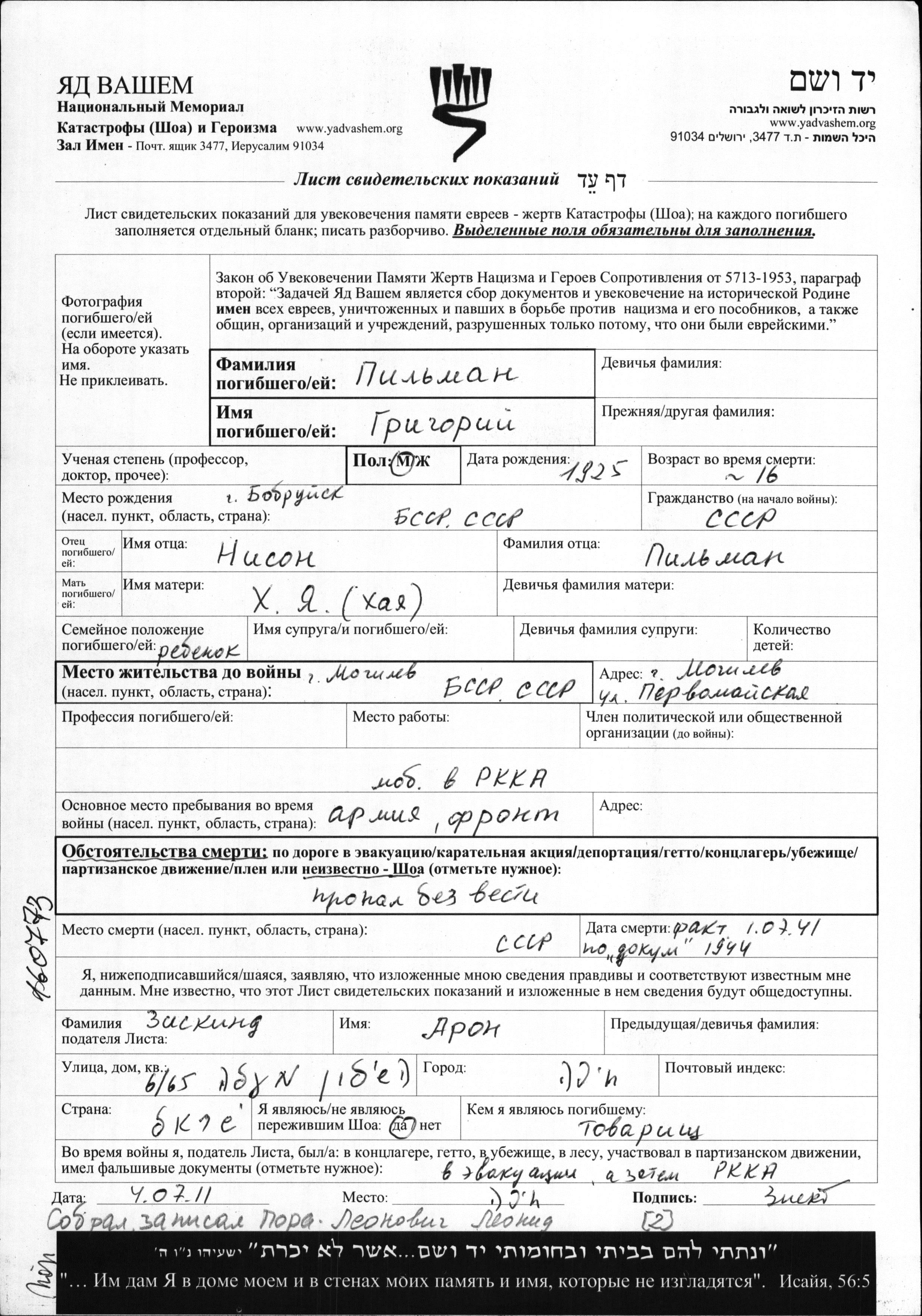 Grigoriy Pilman wurde im Jahr 1925 in Bobruysk, Weißrussland (UdSSR) geboren. Er war der Sohn von Nison und Khaya. Er war Jugendliche/-r. Vor dem Zweiten Weltkrieg lebte er in Mogilev, Weißrussland (UdSSR). Während des Krieges war er in die Sowjetischen Streitkräfte.