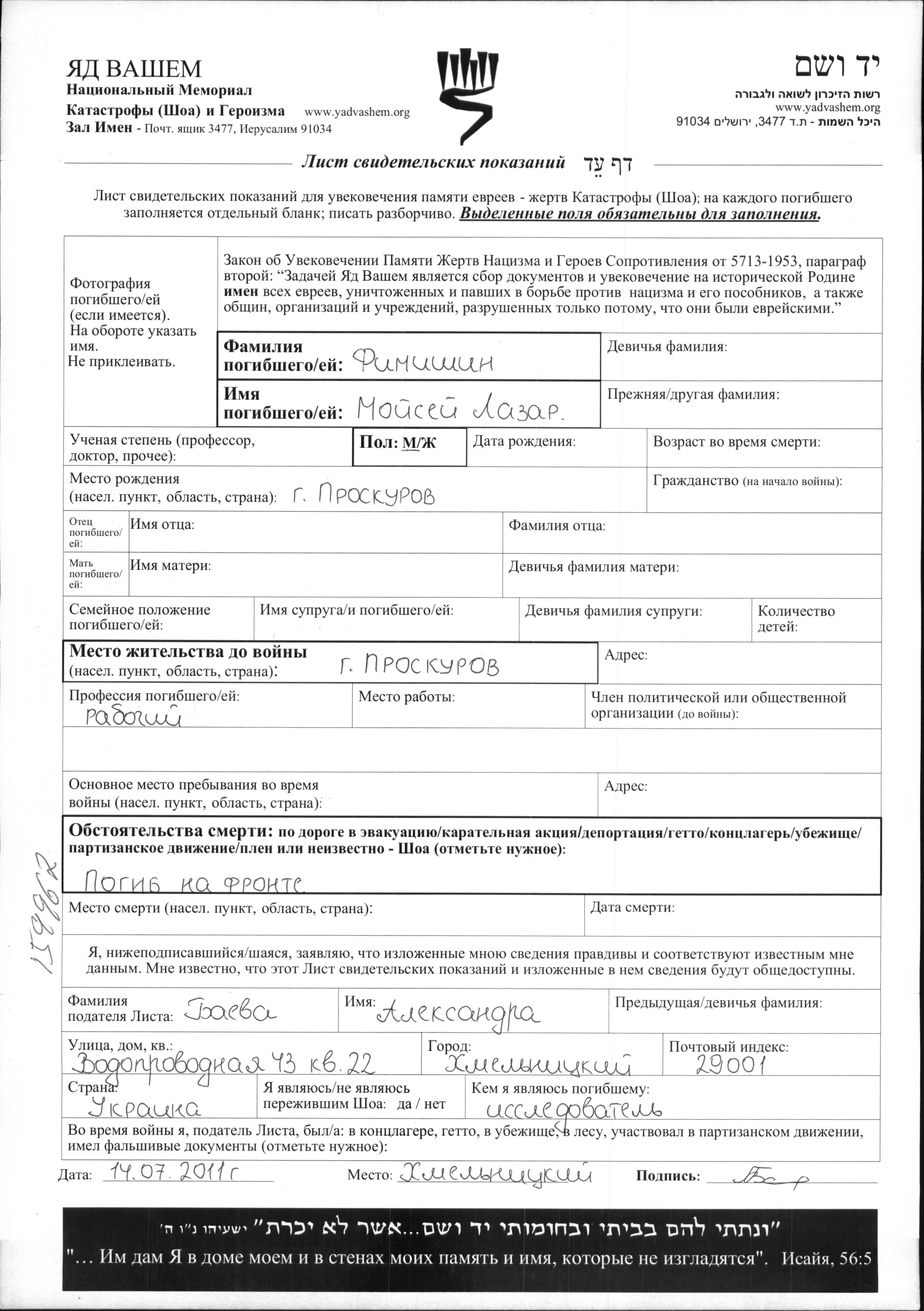Moysey Fimishin wurde in Proskurov, Ukraine (UdSSR) geboren. Er war der Sohn von Lazar. Er war Arbeiter/-in. Vor dem Zweiten Weltkrieg lebte er in Proskurov, Ukraine (UdSSR). Während des Krieges war er in die Sowjetischen Streitkräfte.