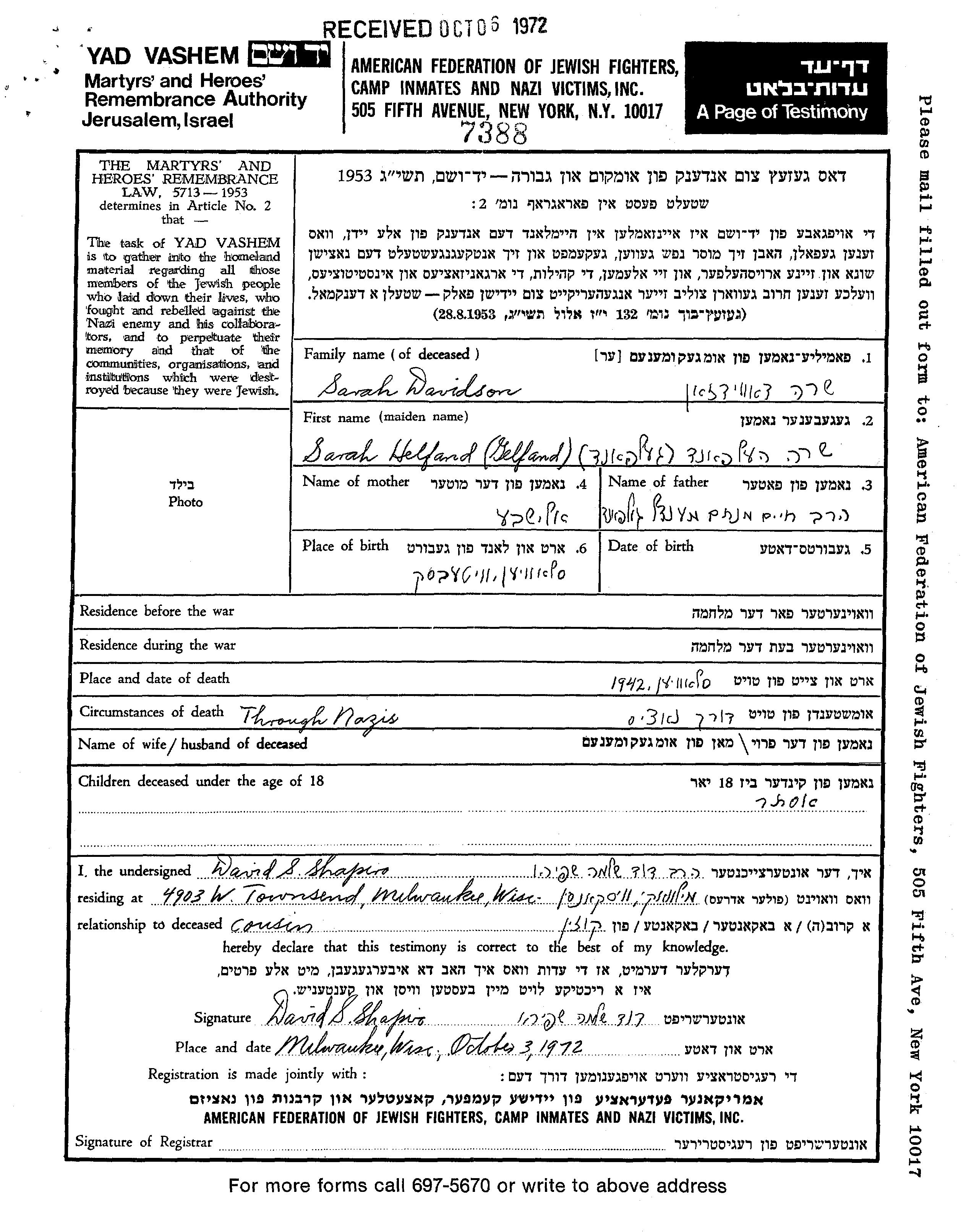 Sarah Davidson, geb. Gelfand wurde in Slavin, Weißrussland (UdSSR) geboren. Sie war die Tochter von Khaim Menakhem und Elisheva. Vor dem Zweiten Weltkrieg lebte sie in Slavin, Weißrussland (UdSSR). Während des Krieges war sie in Slavin, Weißrussland (UdSSR).