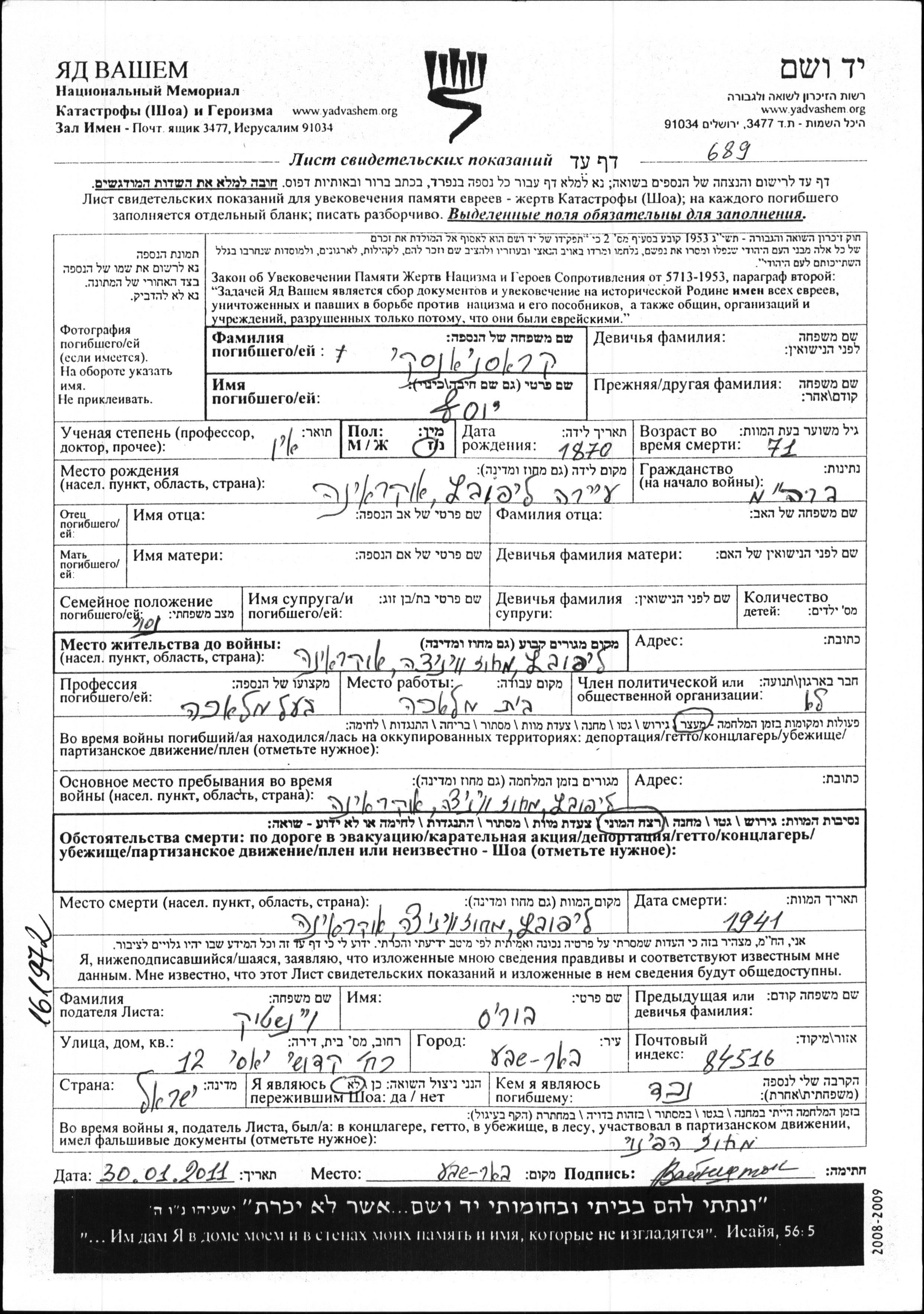 Yosef wurde in der Schoah ermordet. Todesort: Lipovets, Ukraine (UdSSR) im Jahr 1941.