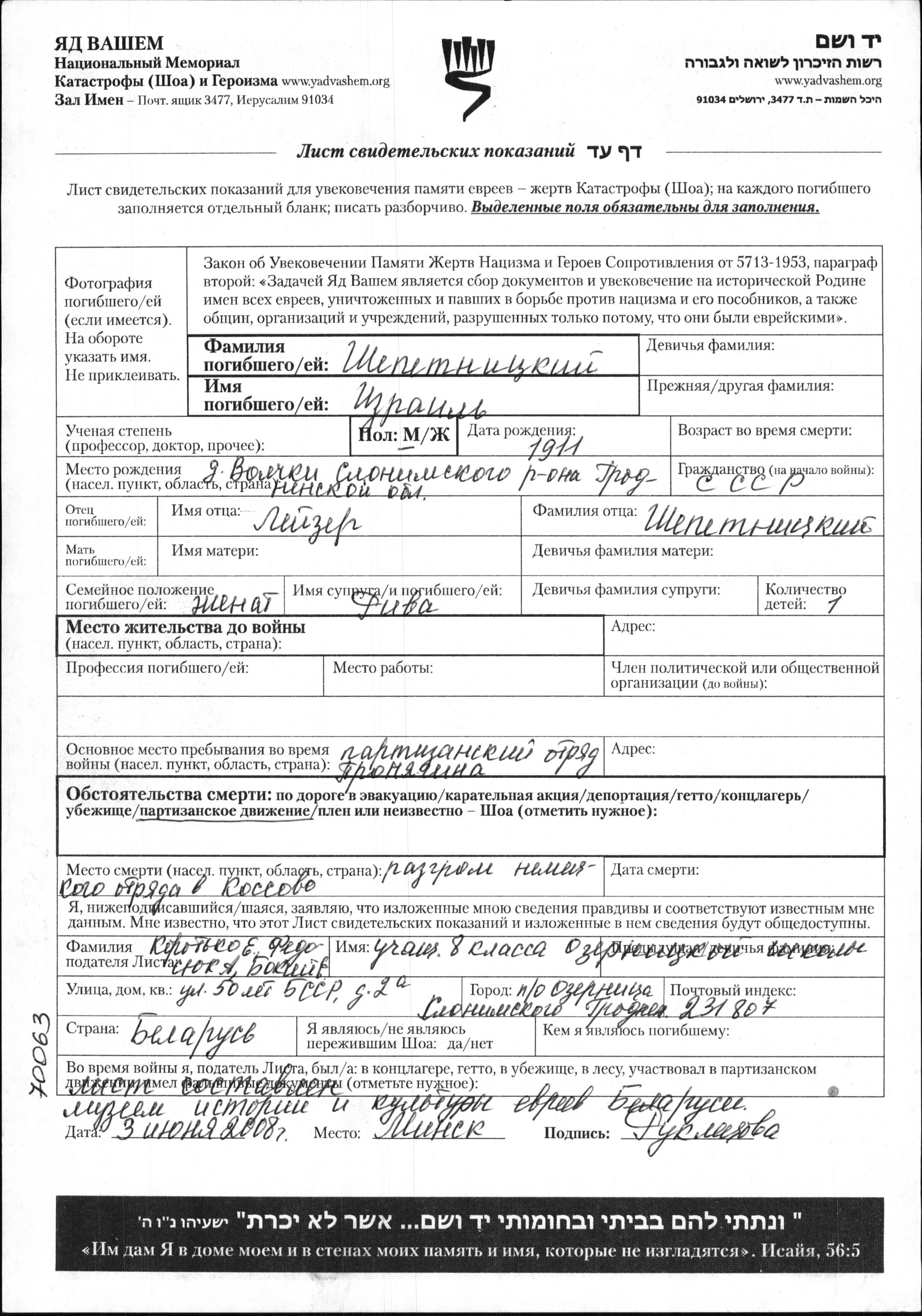 Izrail Shepetnitzki wurde im Jahr 1911 in Volchki, Polen geboren. Er war der Sohn von Leyzer. Er war mit Riva Verheiratet. Vor dem Zweiten Weltkrieg lebte er in Polen. Während des Krieges war er in Polen.