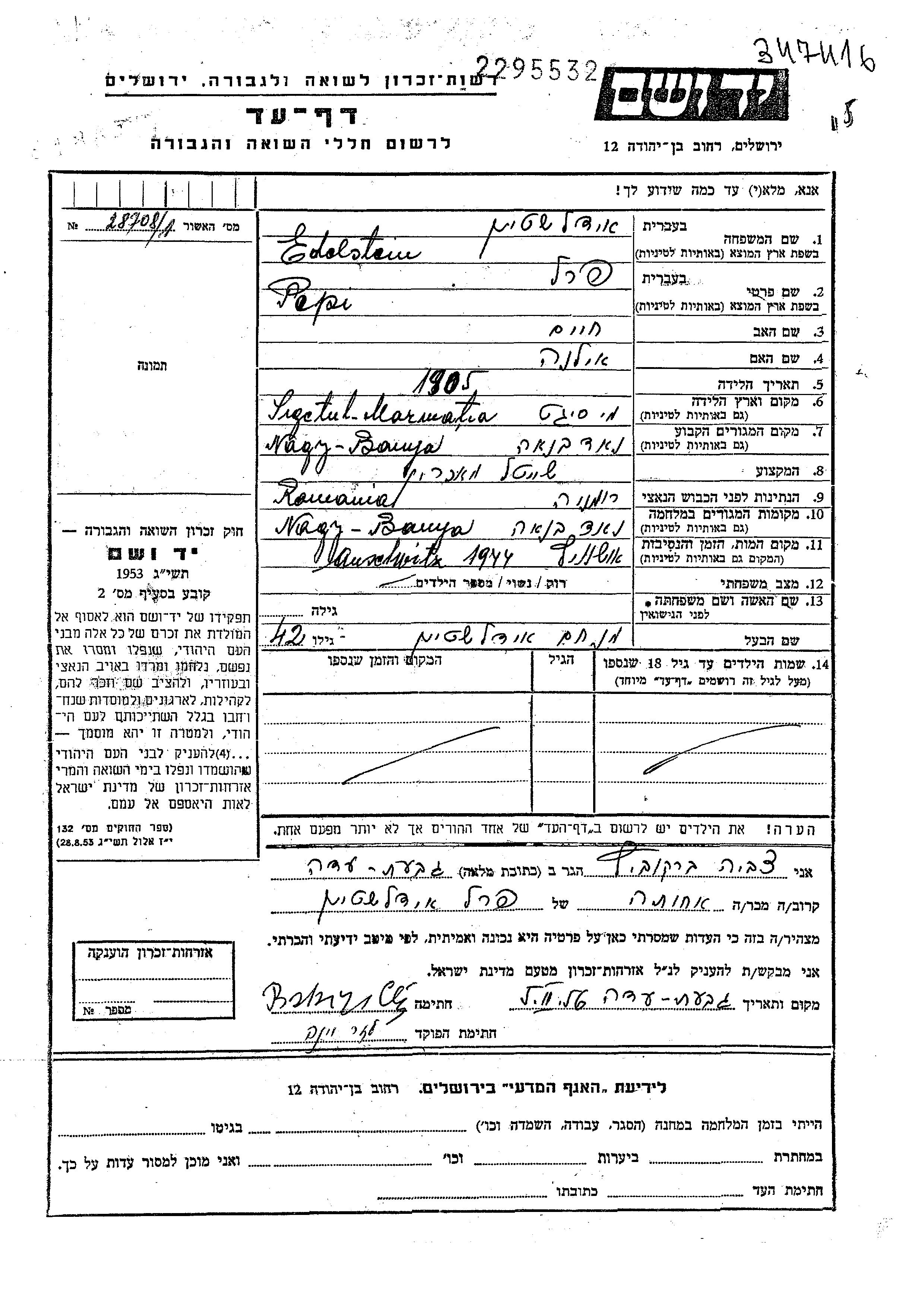 Pepi Perel Edelstain wurde im Jahr 1905 in Sighet, Rumänien geboren. Sie war die Tochter von Khaim und Ilana. Sie war שייטולומאכענין und mit Menakhem Verheiratet. Vor dem Zweiten Weltkrieg lebte sie in Nagy Banya, Rumänien. Während des Krieges war sie in Nagy Banya, Rumänien.
