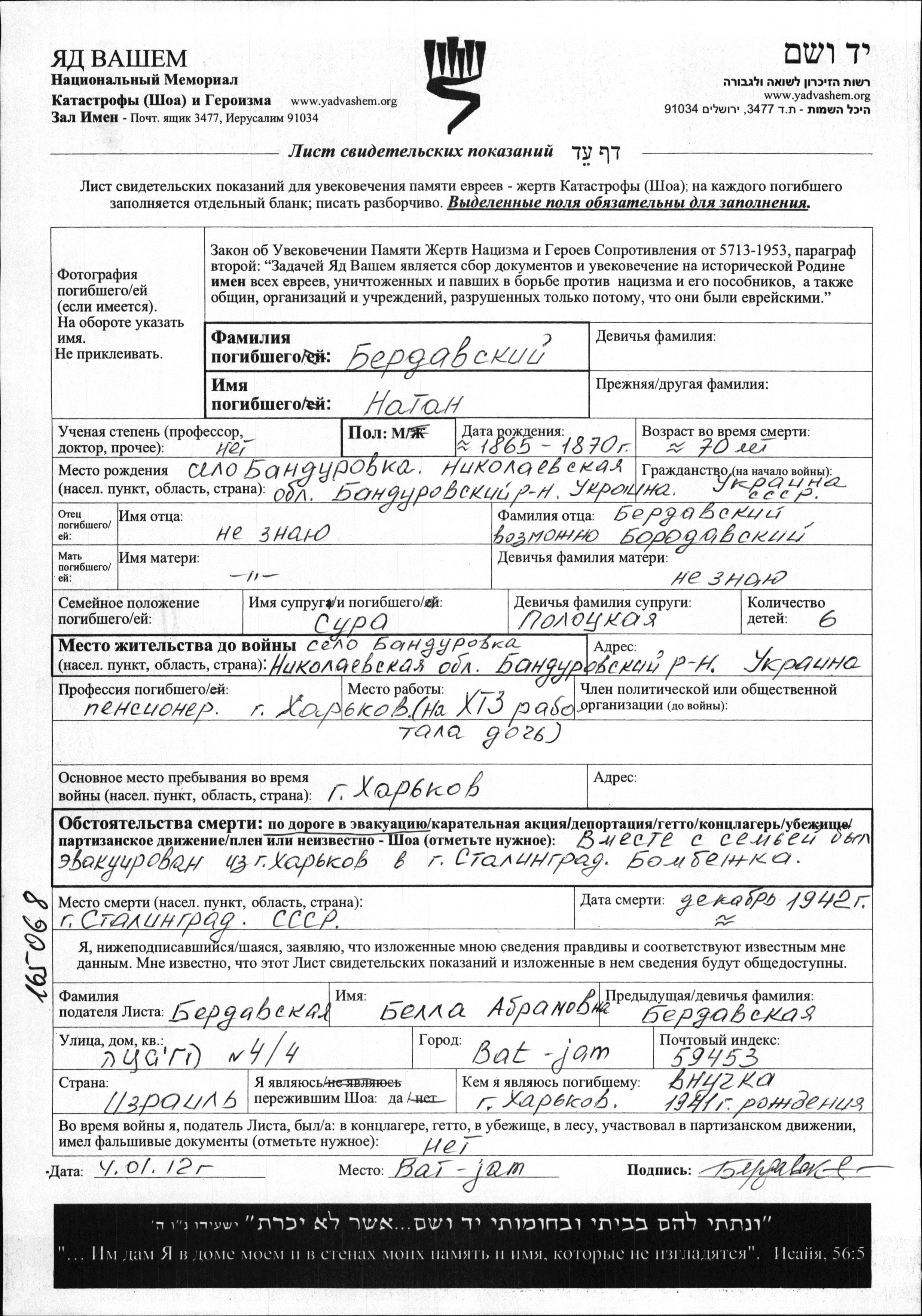 Natan Berdavskiy wurde im Jahr 1870 in Bandurovka, Ukraine (UdSSR) geboren. Er war Rentner/-in und mit Sura, geb. Polotzkaya Verheiratet. Vor dem Zweiten Weltkrieg lebte er in Bandurovka, Ukraine (UdSSR). Während des Krieges war er in Kharkov, Ukraine (UdSSR).
