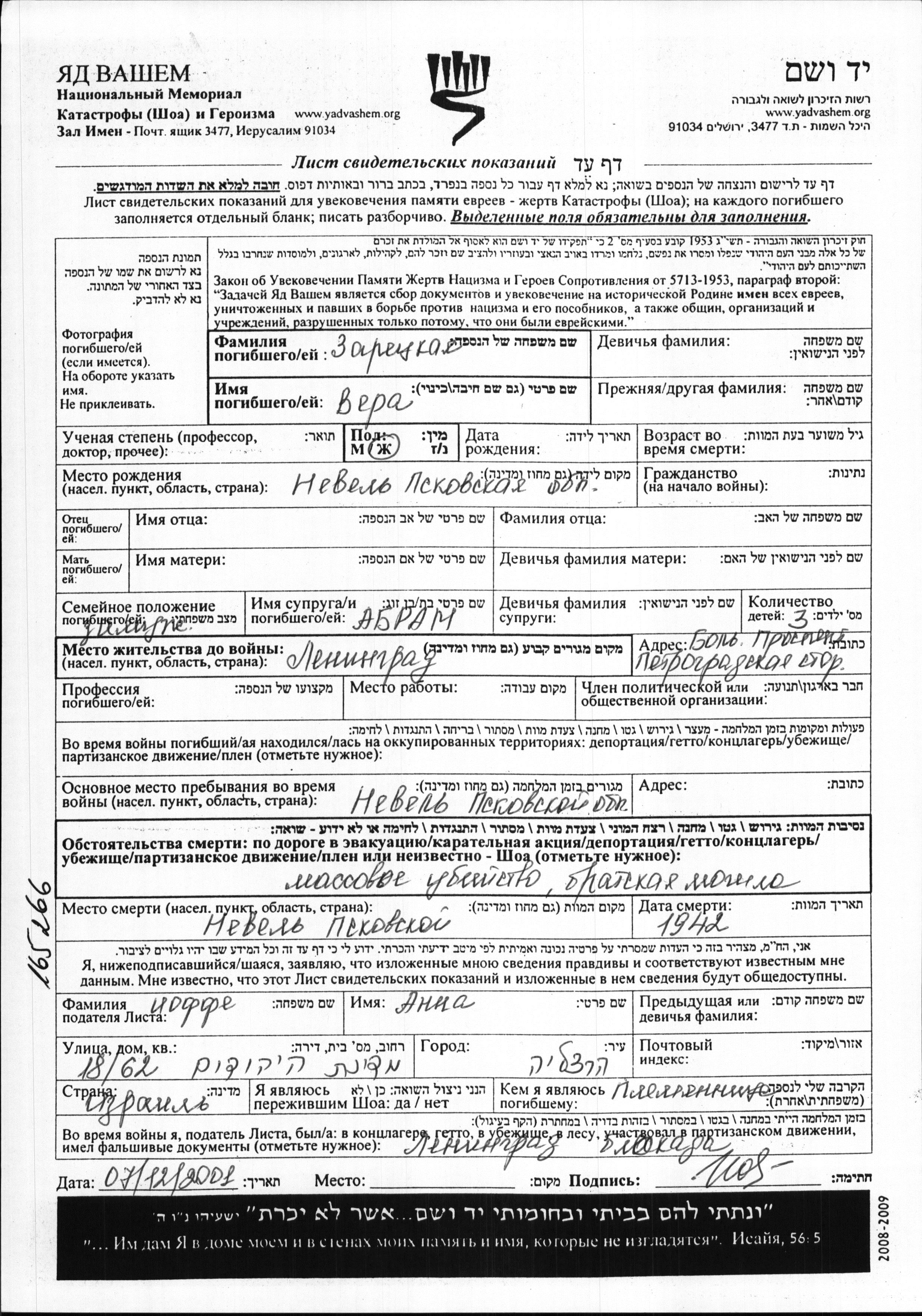 Vera Zaretzkaya wurde in Nevel, Russland (UdSSR) geboren. Sie war mit Abram Verheiratet. Vor dem Zweiten Weltkrieg lebte sie in Leningrad, Russland (UdSSR). Während des Krieges war sie in Nevel, Russland (UdSSR).
