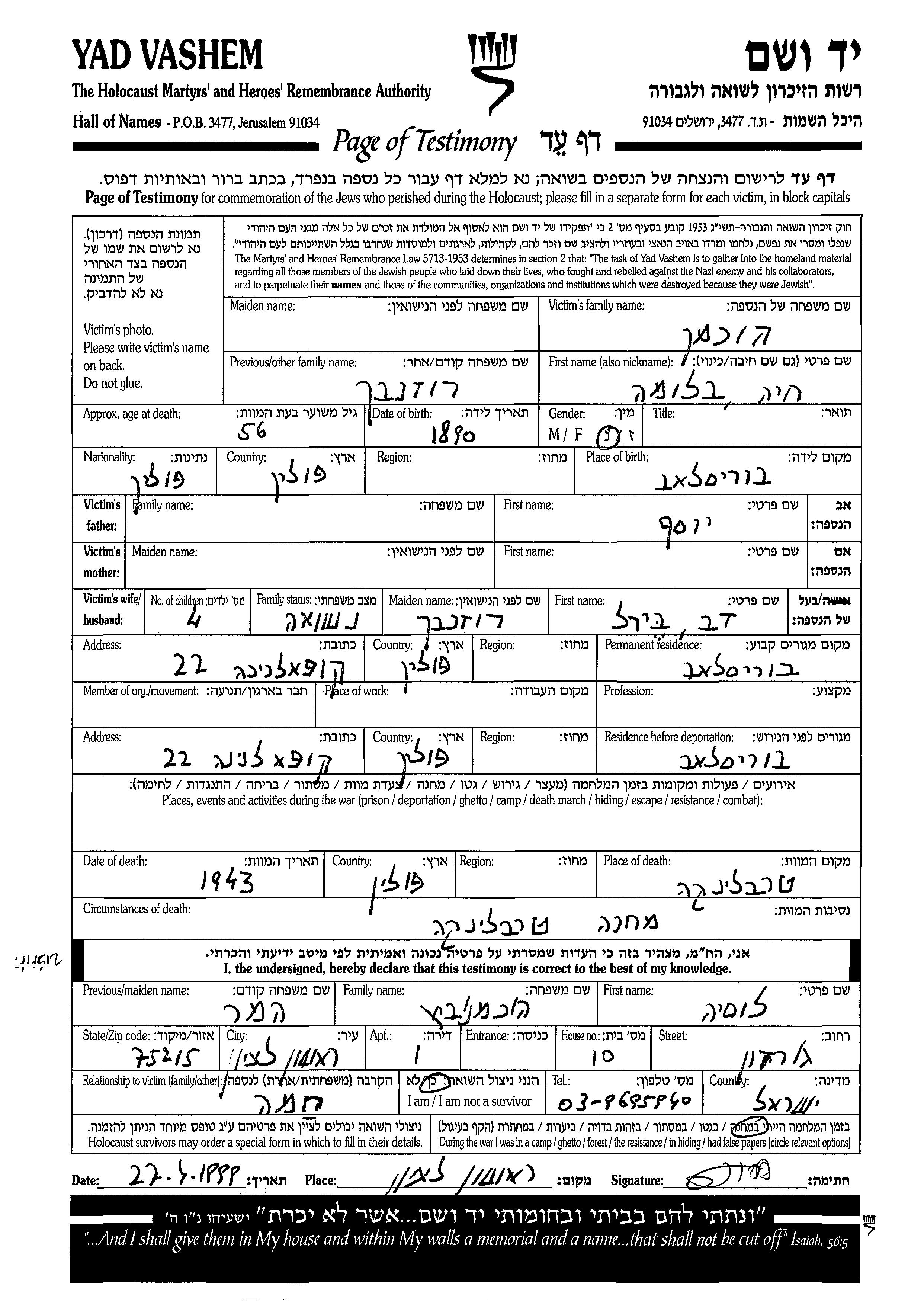Khaia Bluma Hokhman wurde im Jahr 1890 in Borislav, Polen geboren. Sie war die Tochter von Yosef. Sie war mit Dov Byrl, geb. Rozenbakh Verheiratet. Vor dem Zweiten Weltkrieg lebte sie in Borislav, Polen. Während des Krieges war sie in Borislav, Polen.