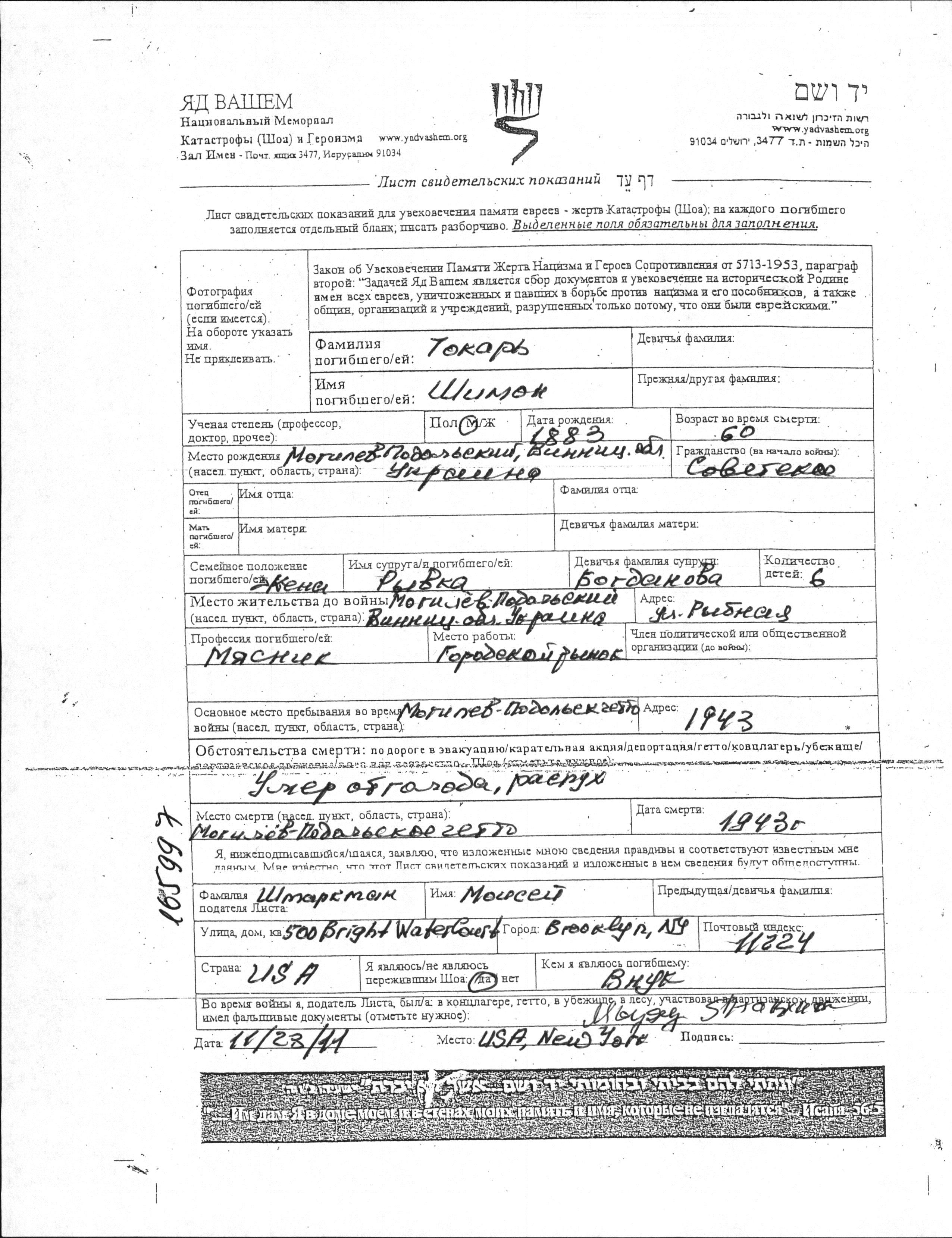 Шимон Tokar wurde im Jahr 1883 in Mogilev Podolski, Ukraine (UdSSR) geboren. Er war Metzger/-in und mit Ryvka, geb. Bogdanova Verheiratet. Vor dem Zweiten Weltkrieg lebte er in Mogilev Podolski, Ukraine (UdSSR). Während des Krieges war er in Mogilev Podolski, Ukraine (UdSSR).