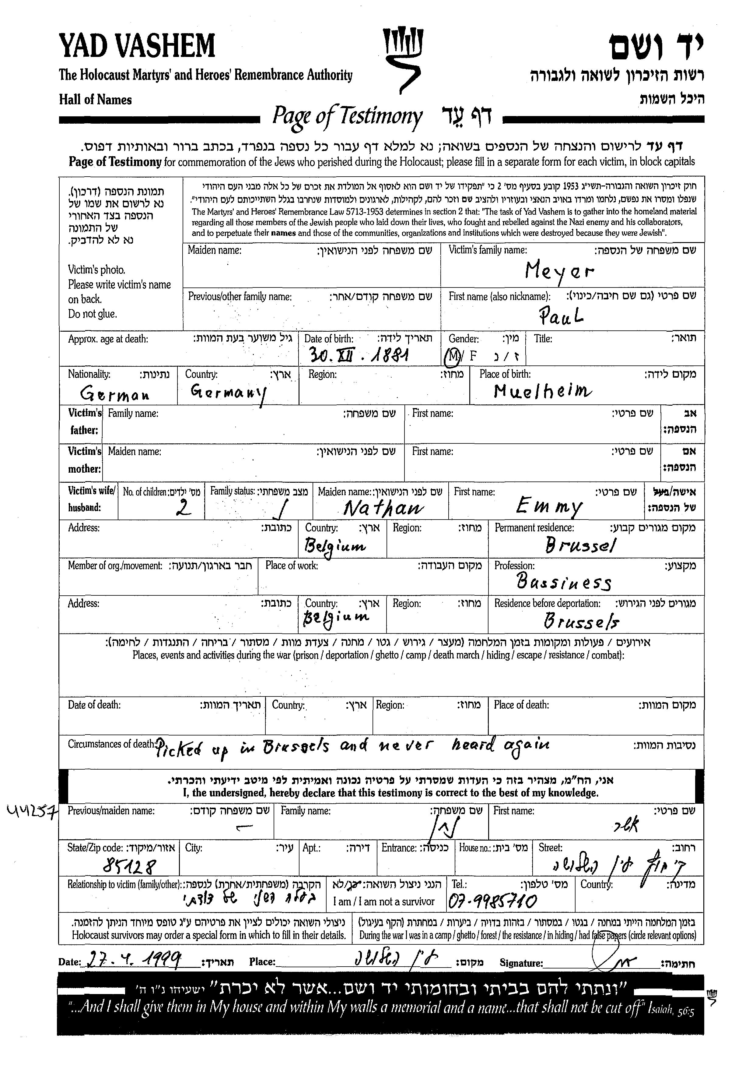 Paul Meyer wurde im Jahr 1881 in Muelheim, Deutsches Reich geboren. Er war Geschäftsmann und mit Emmy, geb. Nathan Verheiratet. Vor dem Zweiten Weltkrieg lebte er in Brussels, Belgien. Während des Krieges war er in Brussels, Belgien.