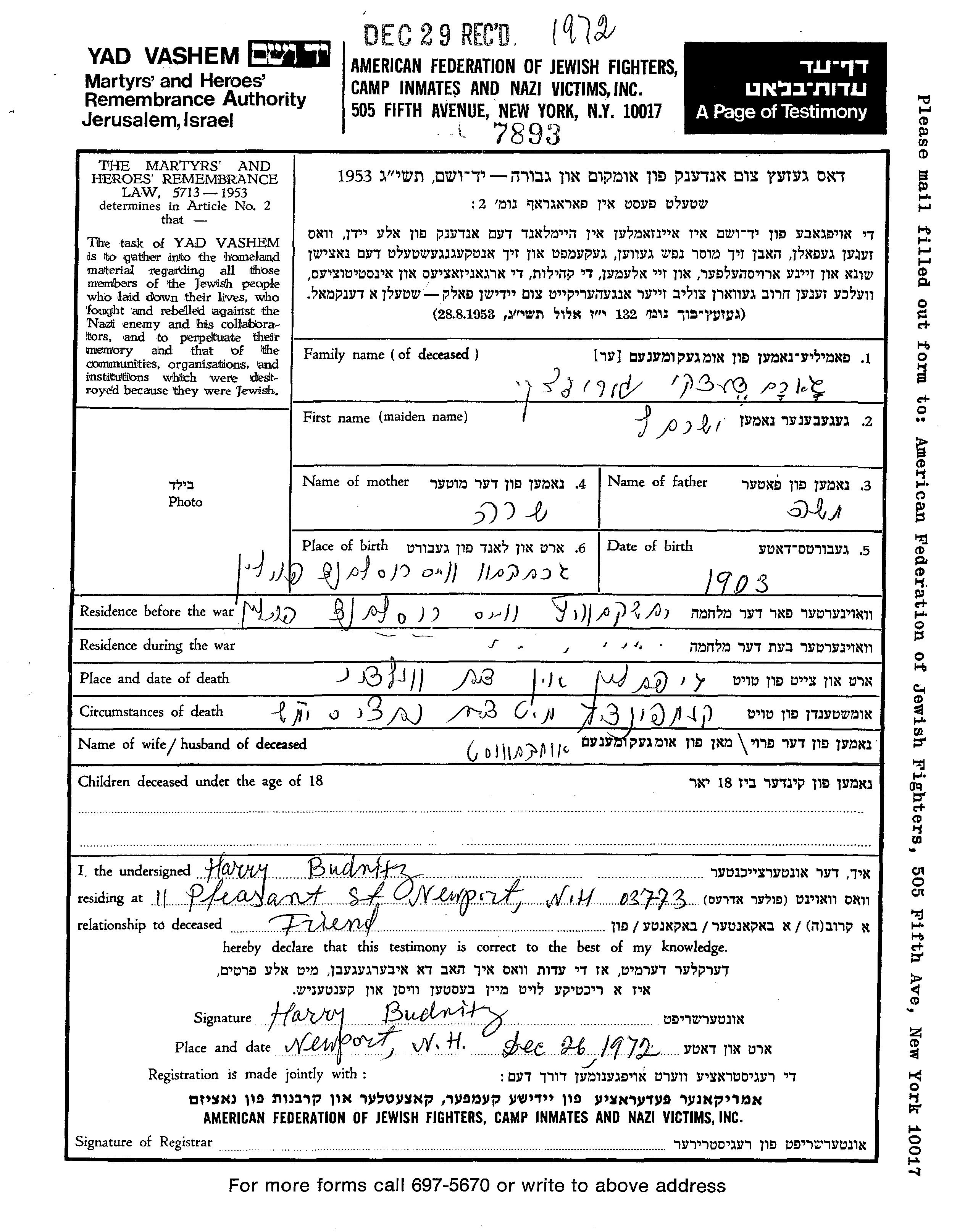 Gorodetzki Yisrael 1903 Jaskowicze, Polen Gedenkblatt