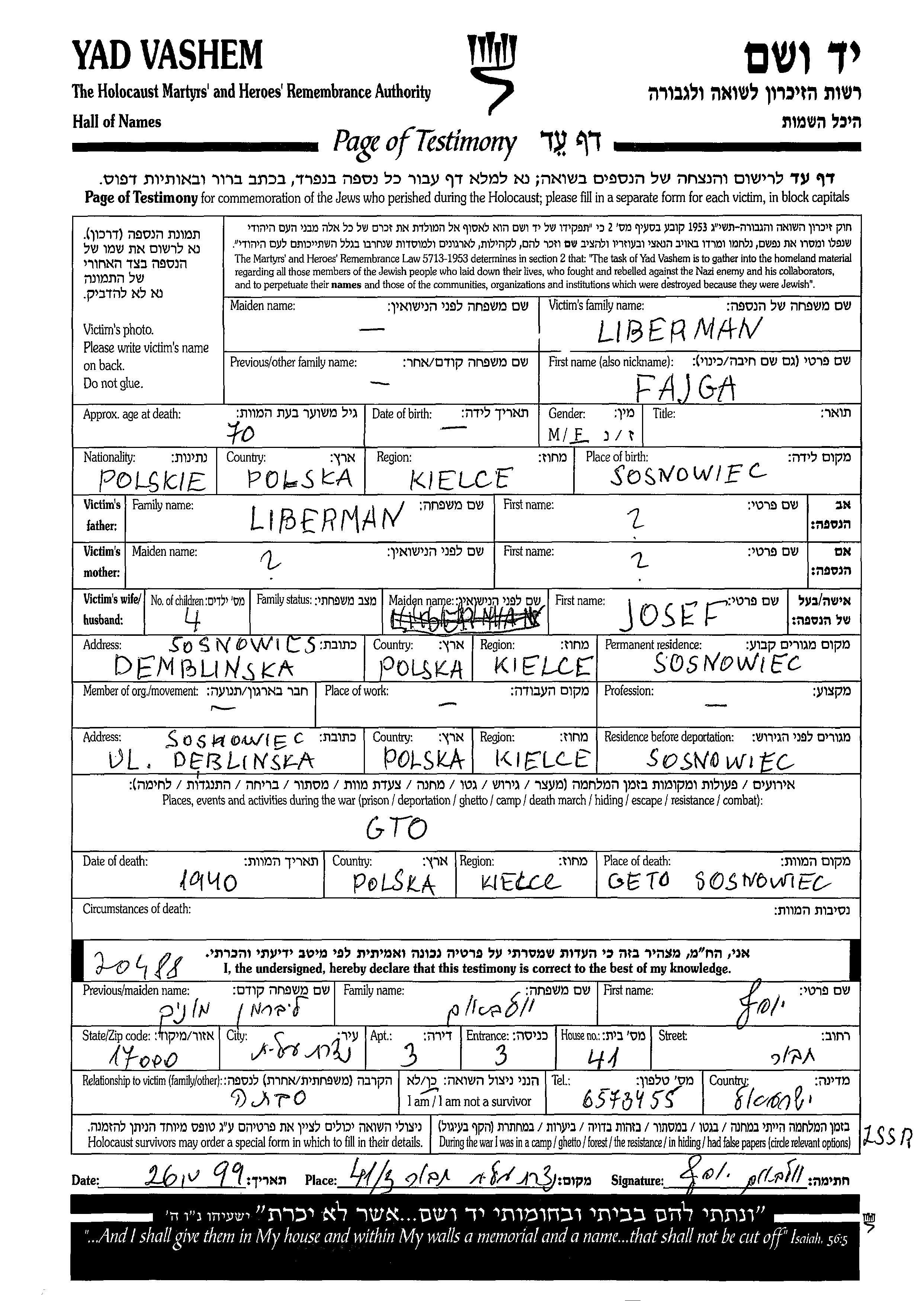 Fajga Liberman wurde in Sosnowic, Polen geboren. Vor dem Zweiten Weltkrieg lebte sie in Sosnowic, Polen. Während des Krieges war sie in Sosnowic, Polen.