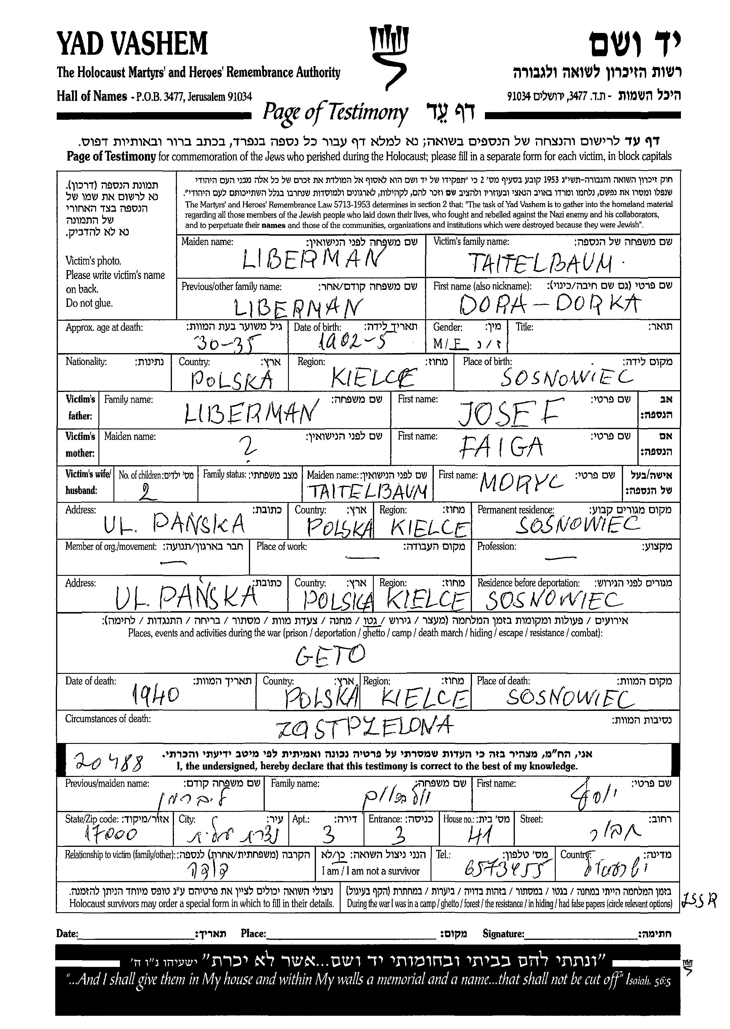 Dora Taitelbaum, geb. Liberman wurde im Jahr 1905 in Sosnowice, Polen geboren. Sie war die Tochter von Josef und Faiga. Sie war mit Moryc, geb. Taitelbaum Verheiratet. Vor dem Zweiten Weltkrieg lebte sie in Sosnowice, Polen. Während des Krieges war sie in Sosnowice, Polen.