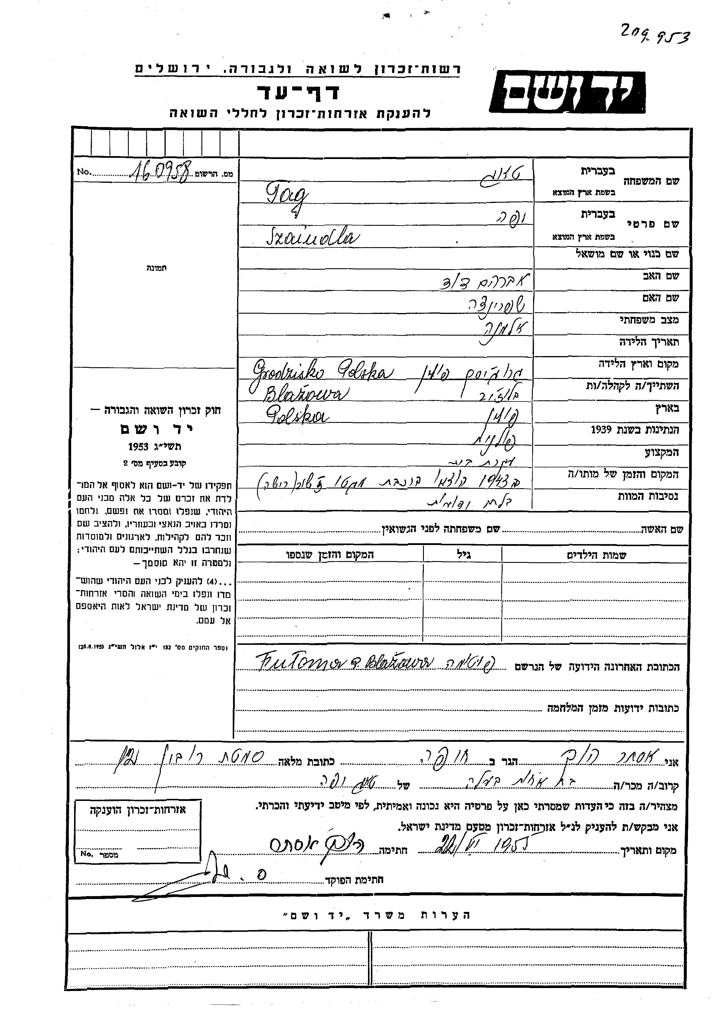 Szaindla Yafa Tag, geb. Tapel wurde in Grodzisko, Polen geboren. Sie war Hausfrau.