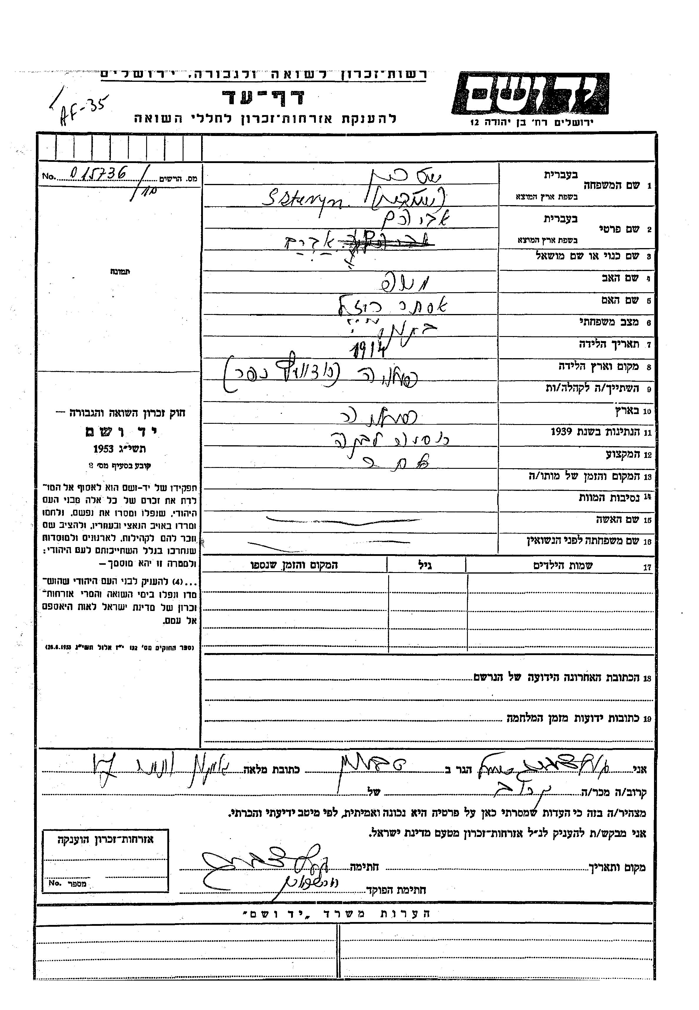 Avraham Szteryn wurde im Jahr 1914 in Radovichi, Polen geboren. Er war der Sohn von Moshe und Ester Reizel. Er war Kaufmann/-frau. Vor dem Zweiten Weltkrieg lebte er in Polen. Während des Krieges war er in Weißrussland (UdSSR).