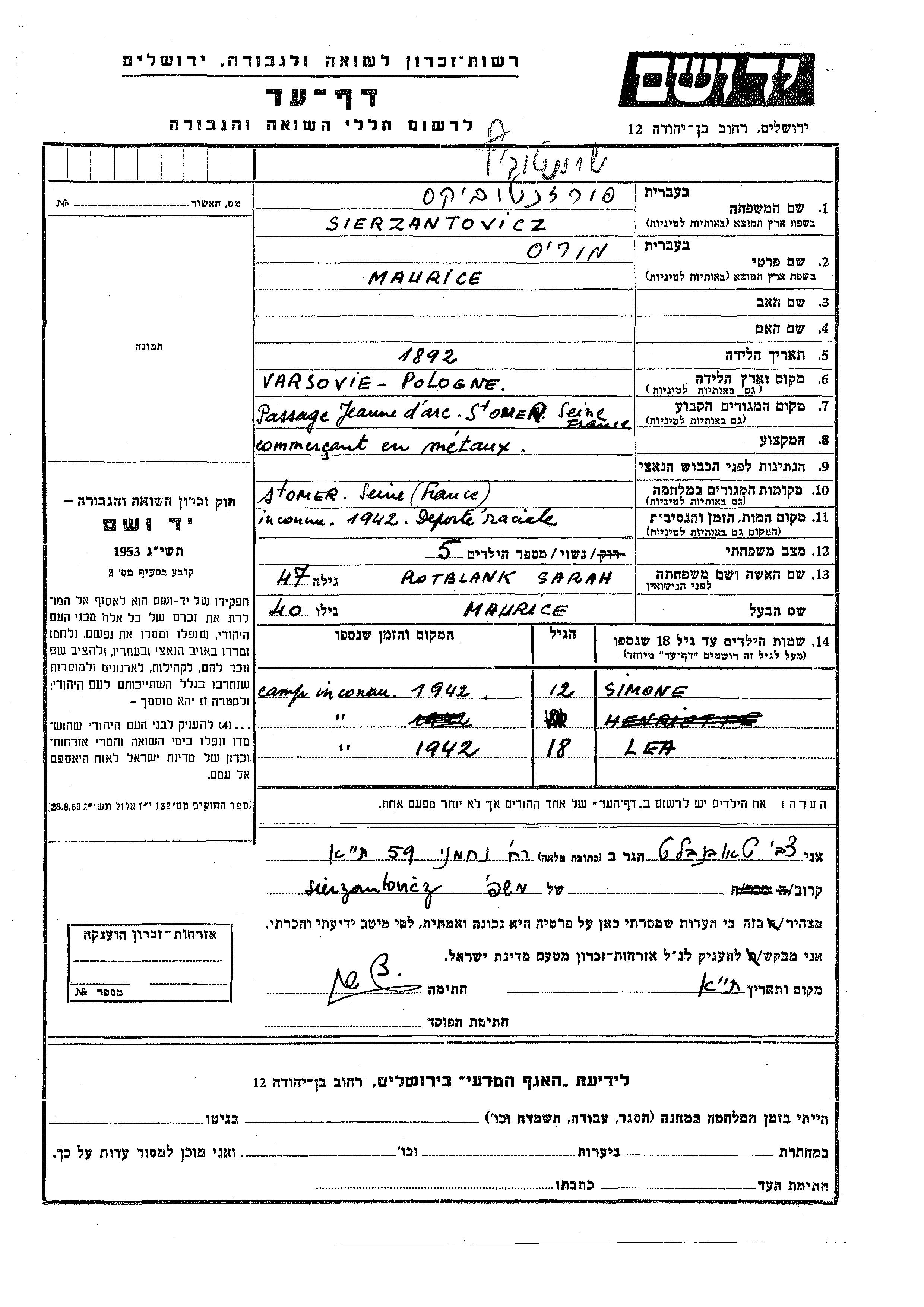 Maurice Sierzantovicz wurde im Jahr 1892 in Varsovia, Polen geboren. Er war Metallhändler und mit Sarah, geb. Rotblank Verheiratet. Vor dem Zweiten Weltkrieg lebte er in Saint Ouen, Frankreich. Während des Krieges war er in Saint Ouen, Frankreich.