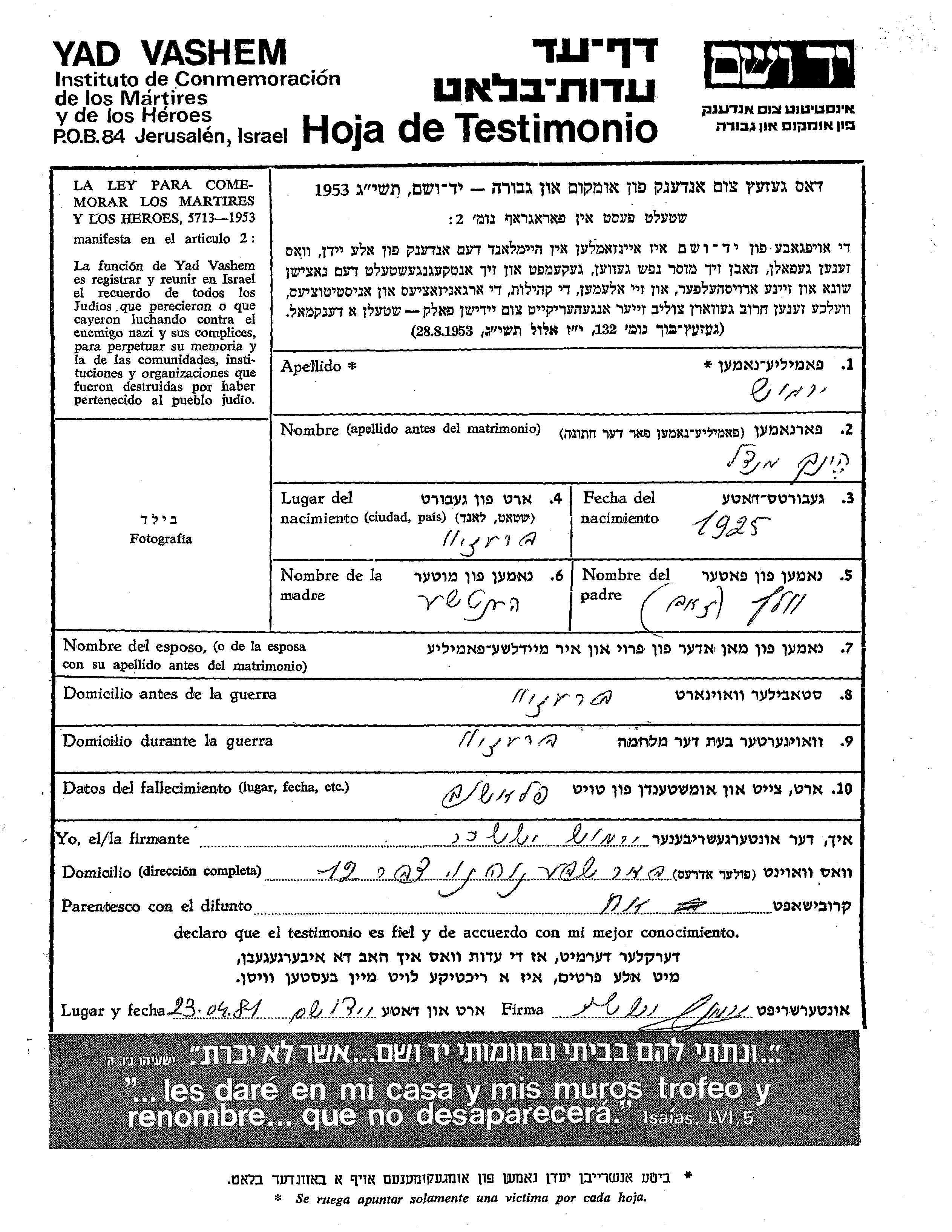 Hinek Mendel Ieremiash wurde im Jahr 1925 in Breziv, Polen geboren. Er war der Sohn von Volf Zeev und Khana. Vor dem Zweiten Weltkrieg lebte er in Breziv, Polen. Während des Krieges war er in Breziv, Polen.