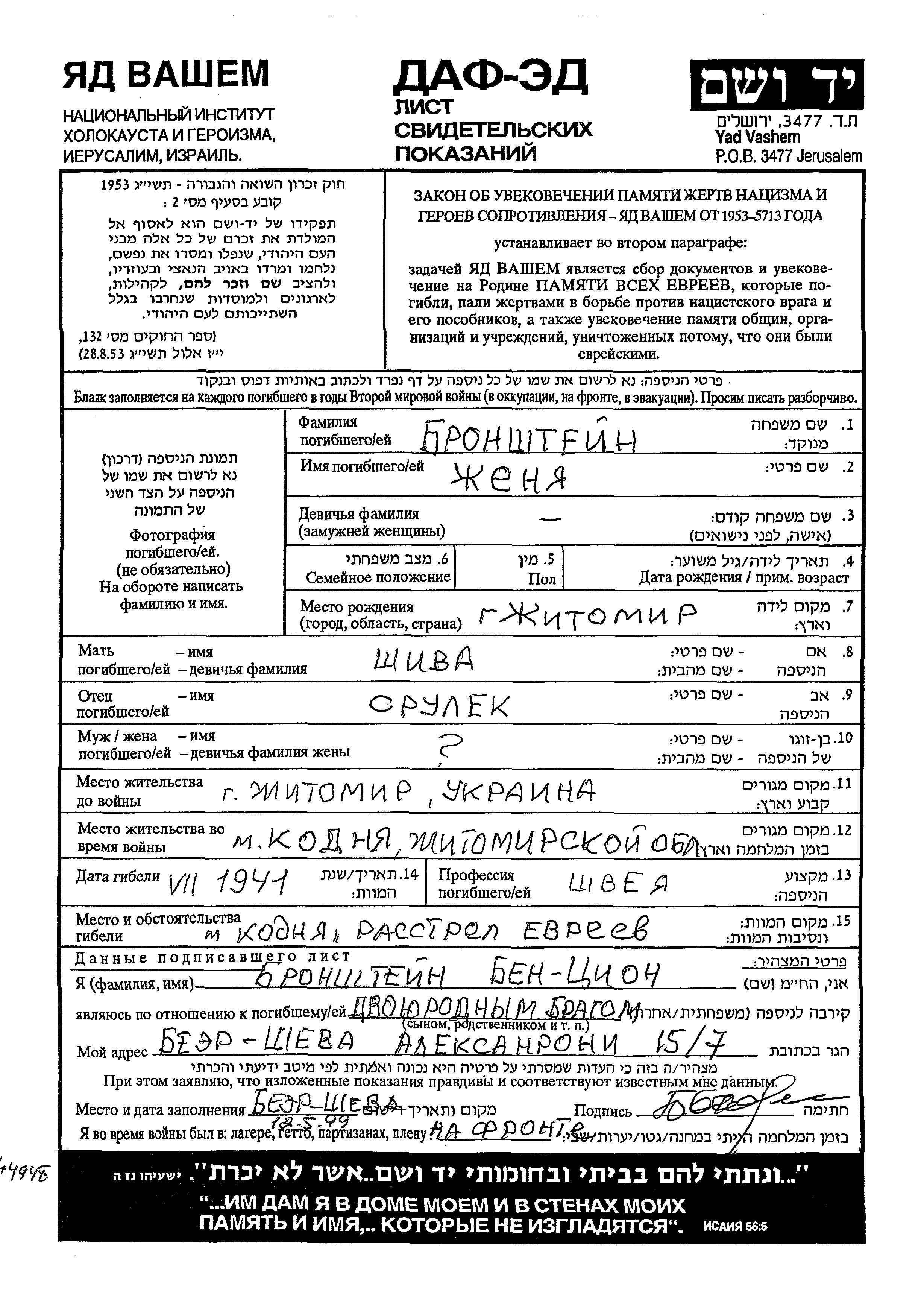 Bronshtein Zhenya Zhitomir, Ukraine (UdSSR) Gedenkblatt
