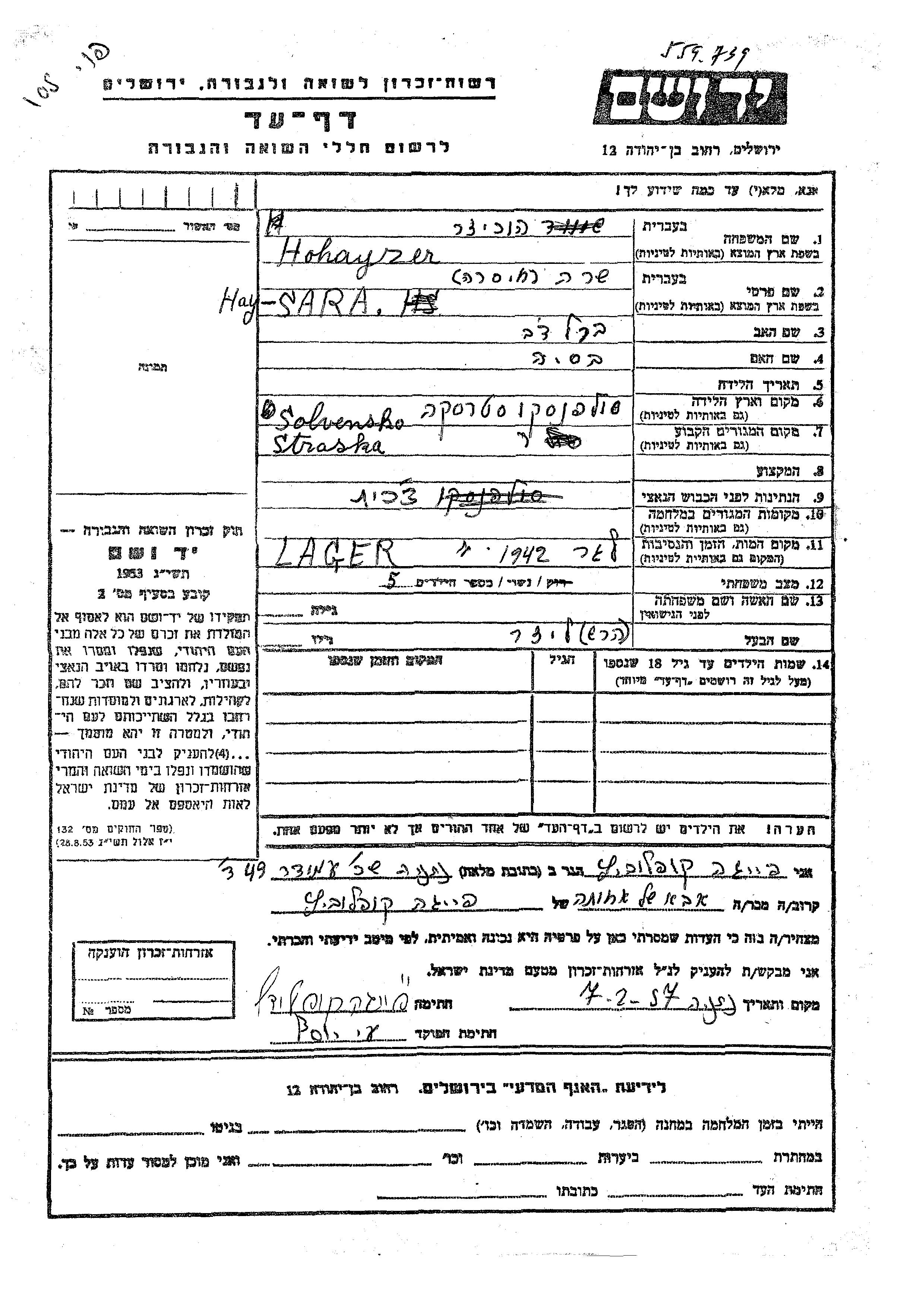 Hay Sara Hohayzer wurde in Slovensko Straska, Tschechoslowakei geboren. Sie war die Tochter von Berl Dov und Basia. Sie war mit Hersh Eliezer Verheiratet. Vor dem Zweiten Weltkrieg lebte sie in Slovensko Straska, Tschechoslowakei.