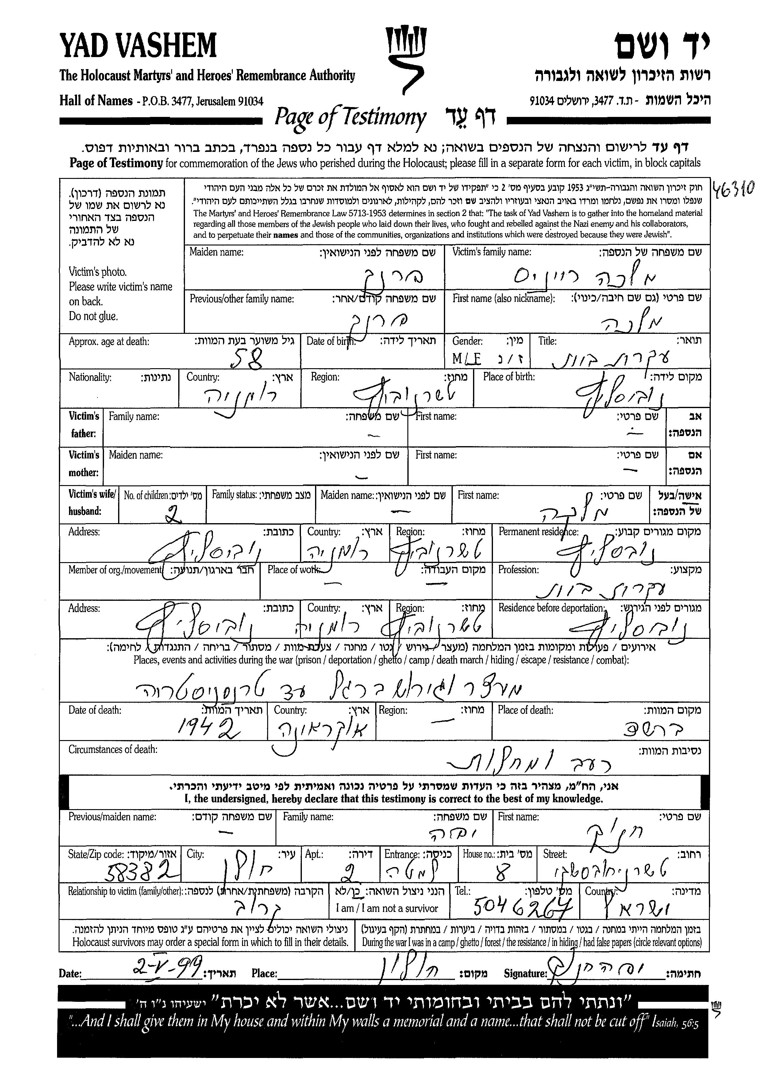 Malka Reinis, geb. Frank wurde in Novy Selec, Rumänien geboren. Sie war Hausfrau. Vor dem Zweiten Weltkrieg lebte sie in Novy Selec, Rumänien. Während des Krieges war sie in Novy Selec, Rumänien.