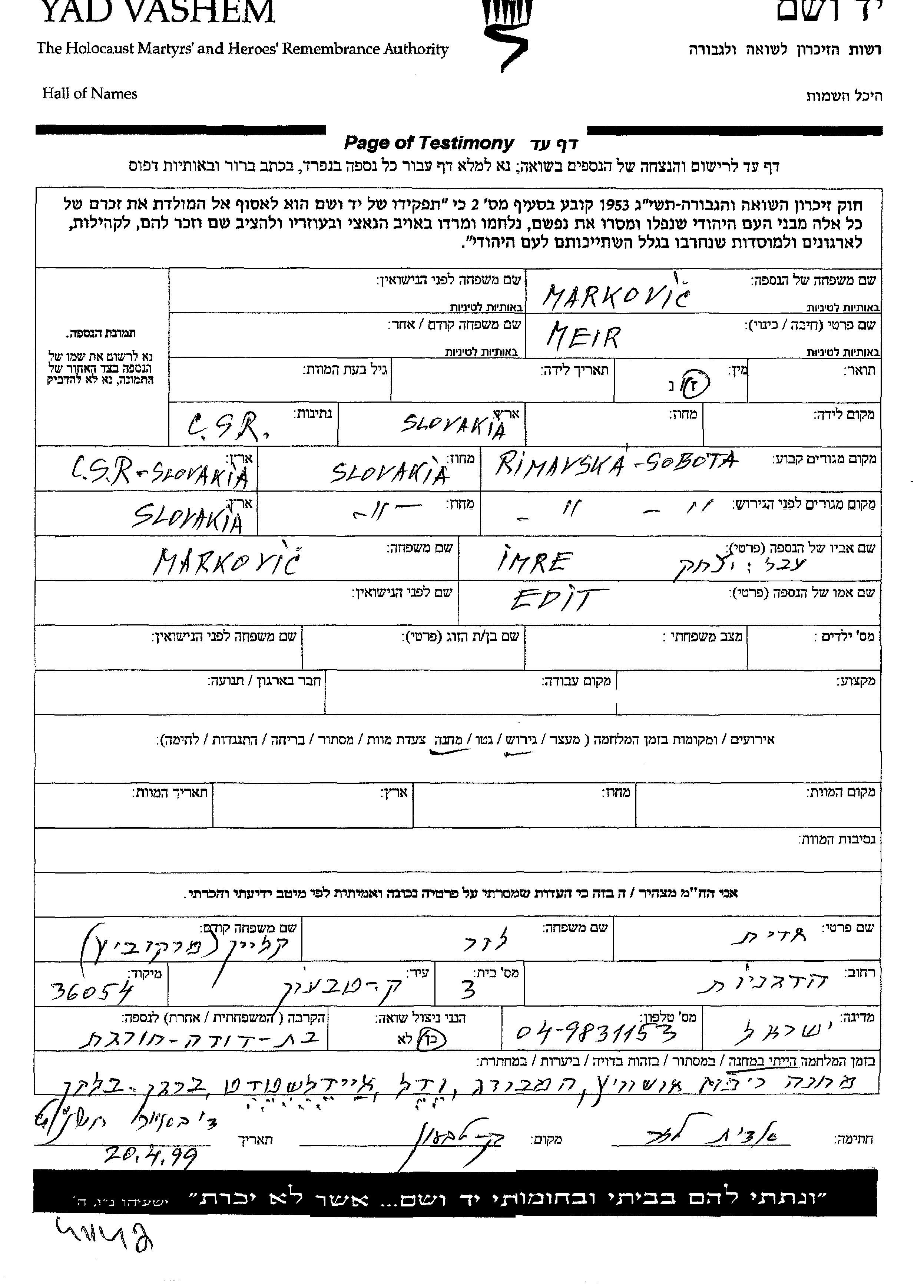 Meir Markovic wurde in Slovakia, Tschechoslowakei geboren. Er war der Sohn von Imre Yitzkhak und Edit. Vor dem Zweiten Weltkrieg lebte er in Rimavska Sobota, Tschechoslowakei. Während des Krieges war er in Rimavska Sobota, Tschechoslowakei.
