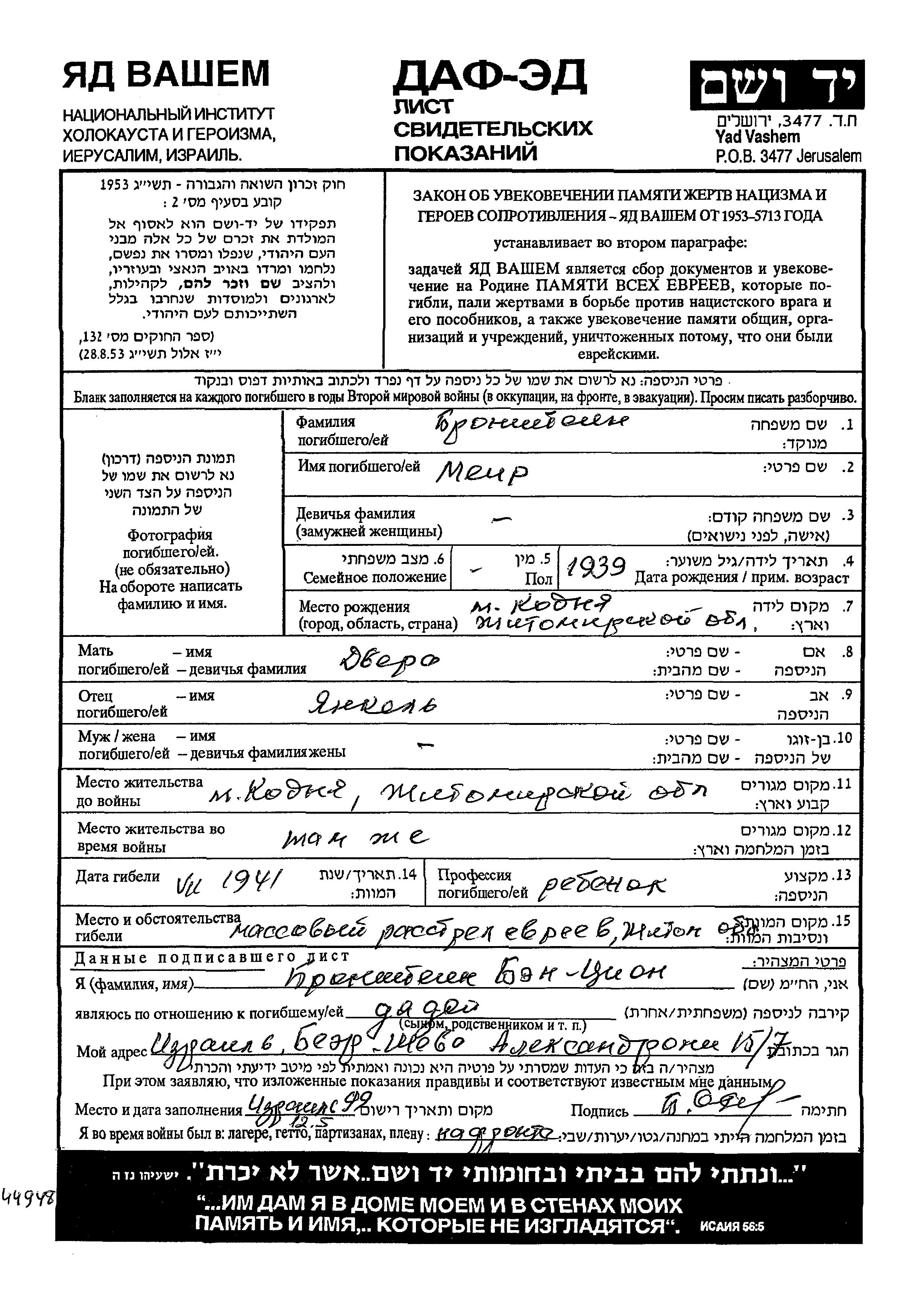Bronshtein Meir 1939 Kodna, Polen Gedenkblatt