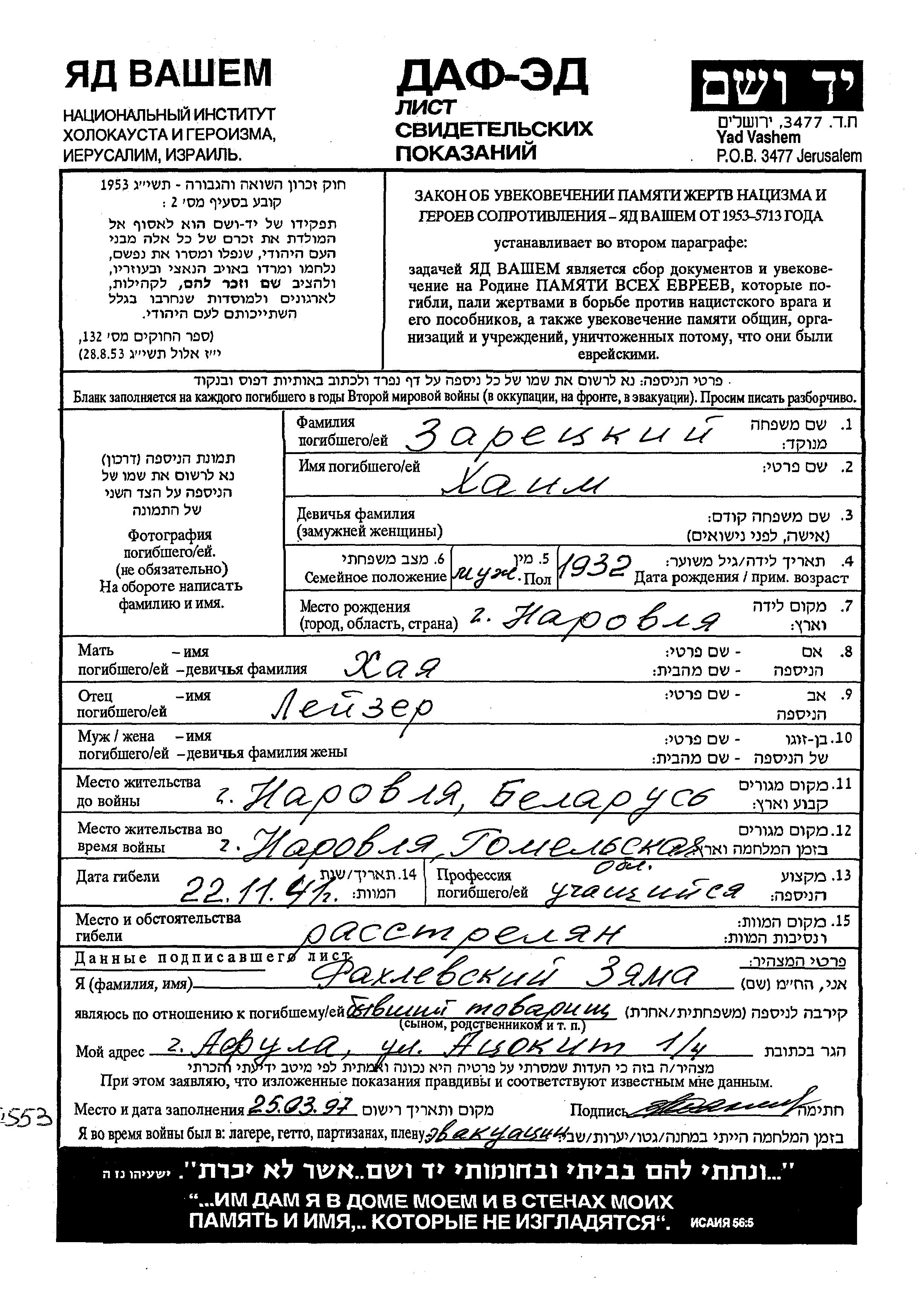 Zaretsky Khaim 1932 Narovlya, Weißrussland (UdSSR) Gedenkblatt