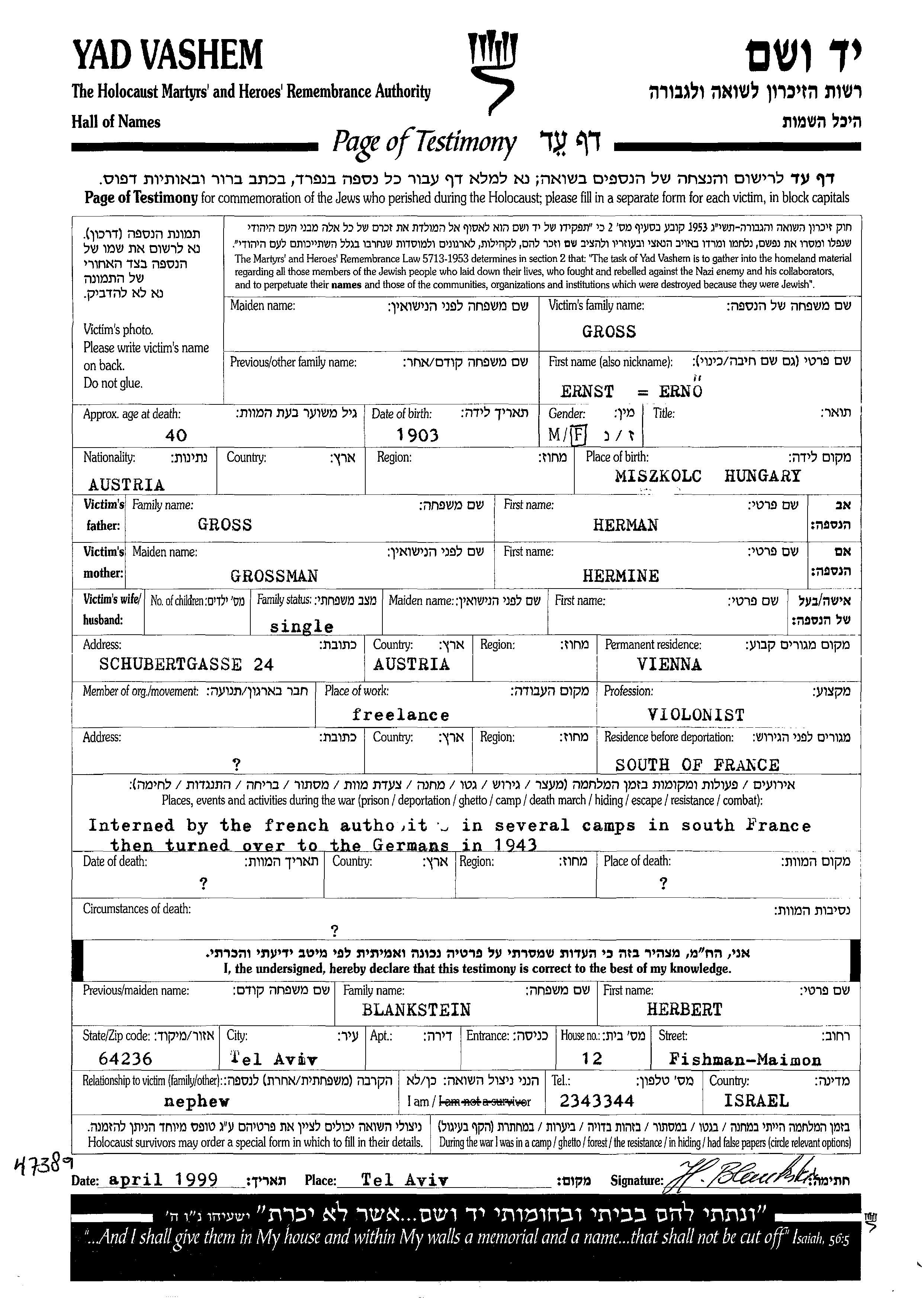 Suche nach einem Todesjahr im Zeitraum der Holocaust: 1933 bis 1945. Bitte wählen Sie 'Exakt' im Auswahlmenü, um nur nach einem einzelnen Jahr zu suchen, alternativ können Sie die flexibleren Optionen '+/- 2 Jahre' oder '+/- 5 Jahre' wählen.