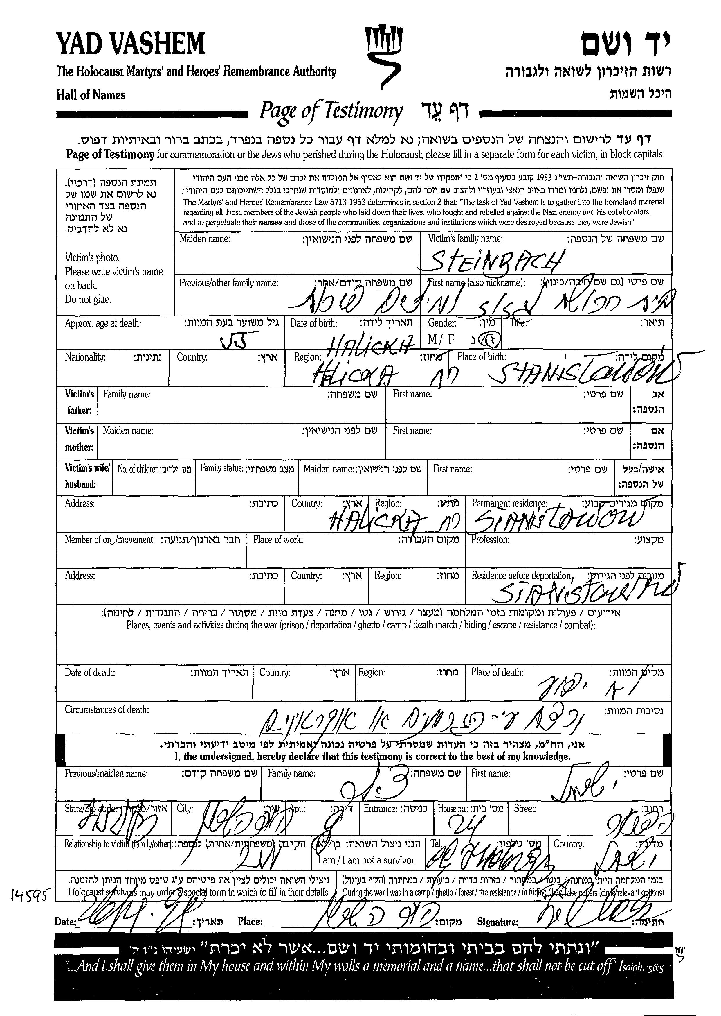 Vorname unbekannt Steinbach wurde in Stanislawow, Polen geboren. Er war Besitzer einer sodawasserfabrik. Vor dem Zweiten Weltkrieg lebte er in Stanislawow, Polen. Während des Krieges war er in Stanislawow, Polen.
