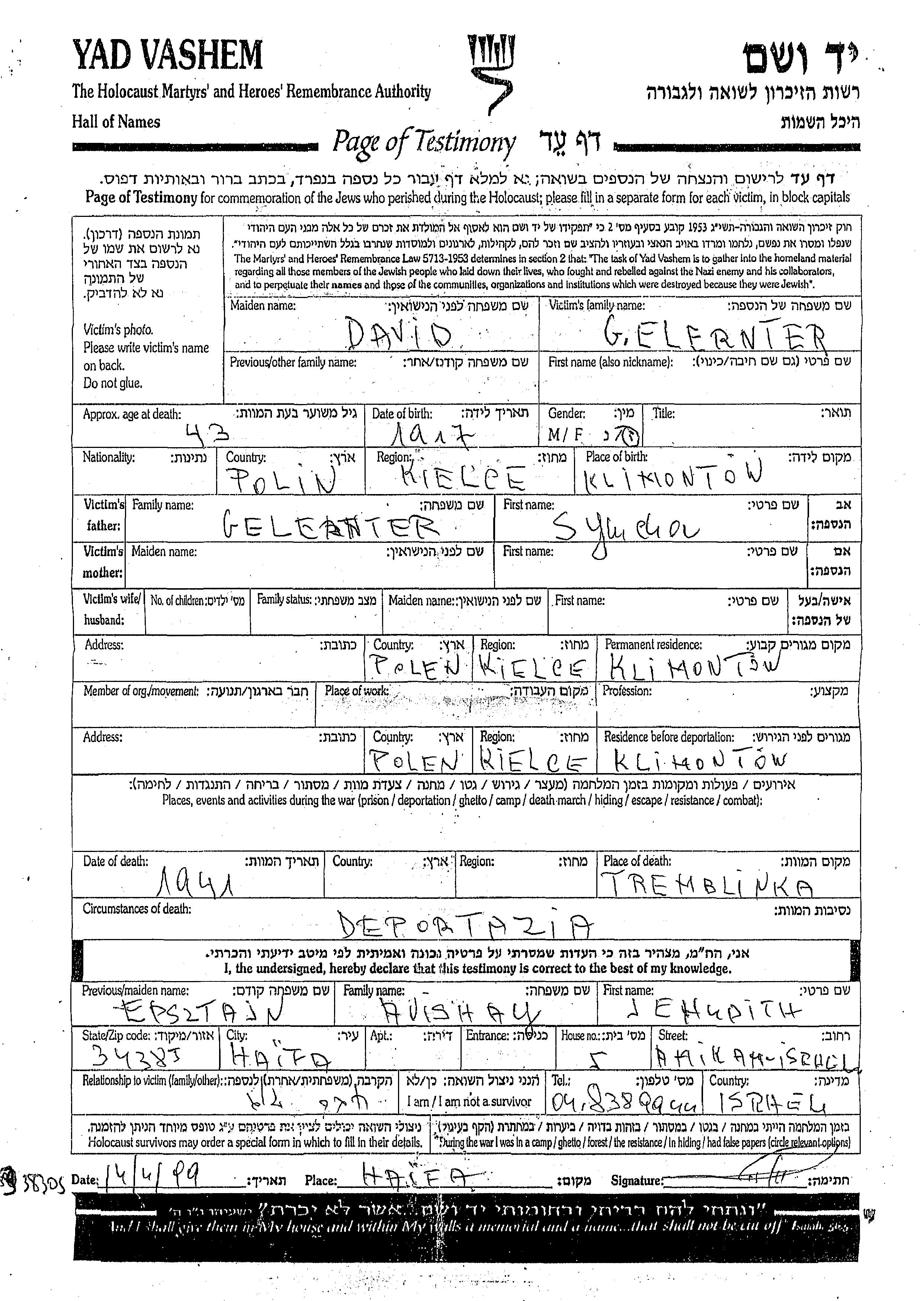 David Gelernter wurde im Jahr 1917 in Klimontow, Polen geboren. Er war der Sohn von Symcha. Vor dem Zweiten Weltkrieg lebte er in Klimontow, Polen. Während des Krieges war er in Klimontow, Polen.