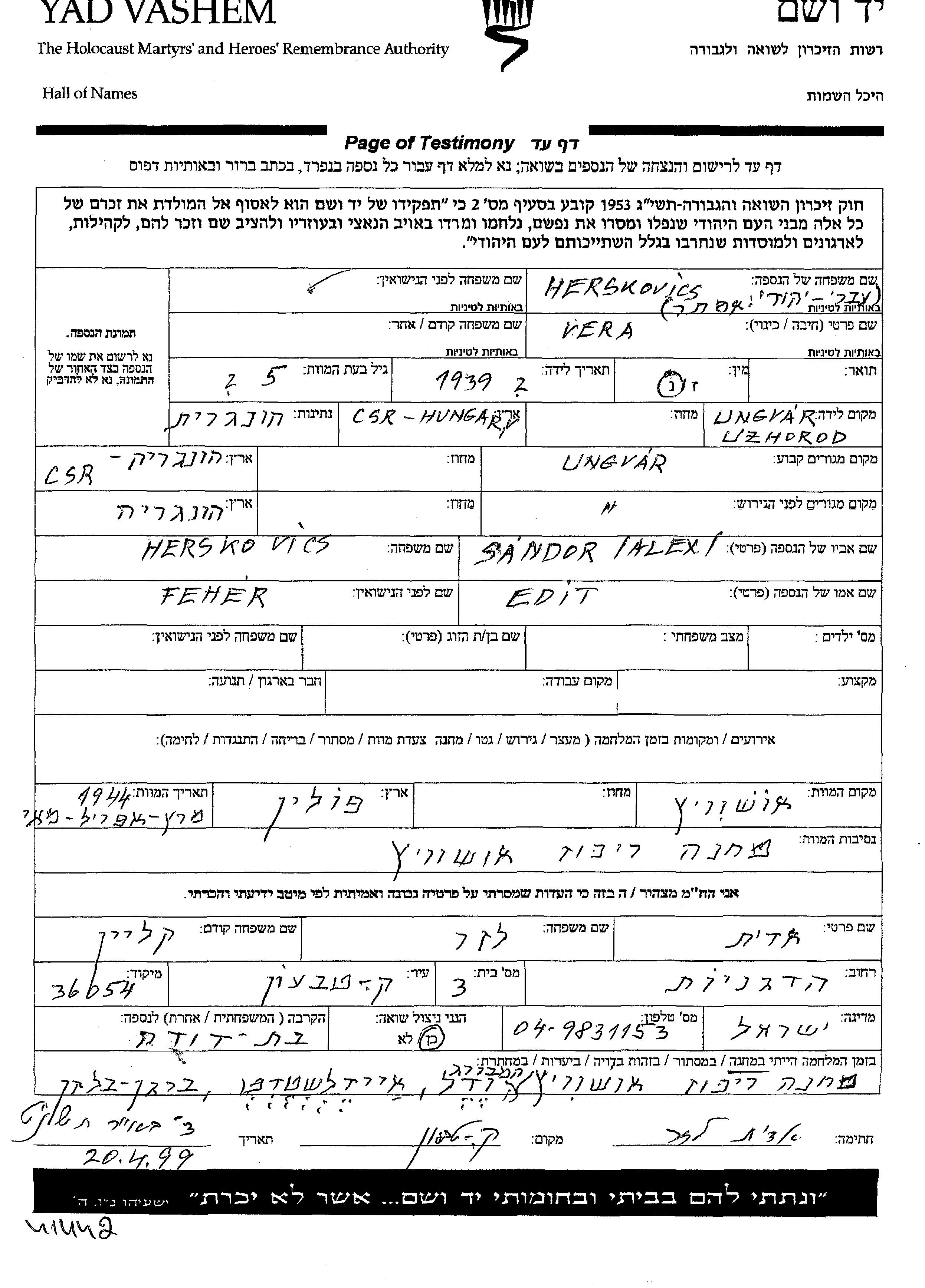 Hershkovics Vera Ester 1939 Ungvar, Tschechoslowakei Gedenkblatt