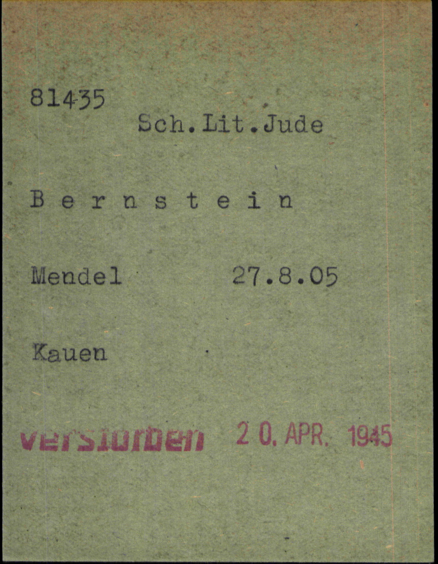 Mendel Bernstein wurde im Jahr 1905 geboren. Vor dem Zweiten Weltkrieg lebte er in Kauen, Litauen. Während des Krieges war er in Dachau, Deutsches Reich. Mendel wurde in der Schoah ermordet. Todesort: Dachau, Deutsches Reich im Jahr 20/04/1945.