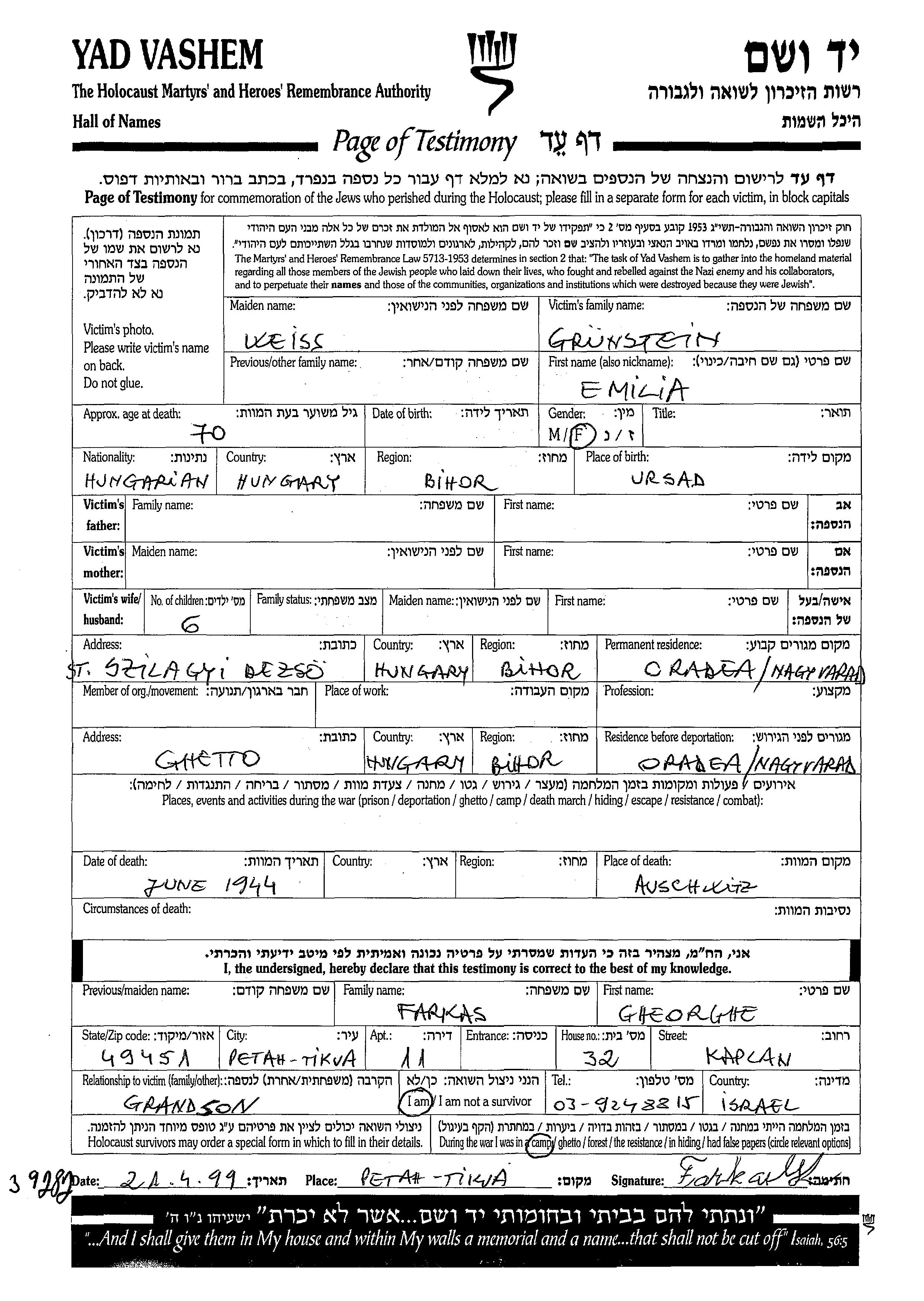 Emilia Grunstein, geb. Weiss wurde in Ursad, Rumänien geboren. Vor dem Zweiten Weltkrieg lebte sie in Oradea Mare, Rumänien. Während des Krieges war sie in Oradea Mare, Rumänien.