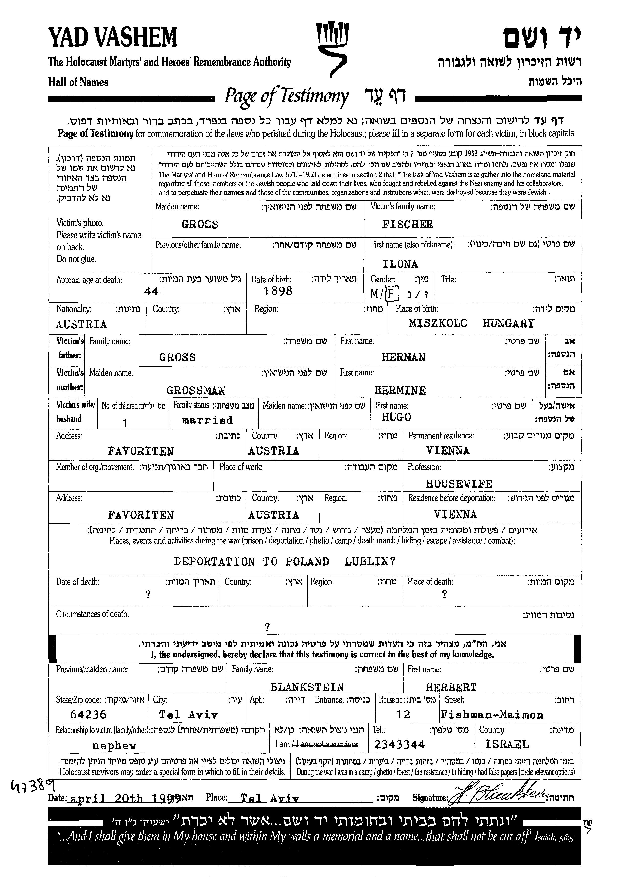 Ilona Fischer, geb. Gross wurde im Jahr 1898 in Miszkolc, Ungarn geboren. Sie war die Tochter von Herman und Hermine. Sie war Hausfrau und mit Hugo Verheiratet. Vor dem Zweiten Weltkrieg lebte sie in Vienna, Österreich. Während des Krieges war sie in Vienna, Österreich.