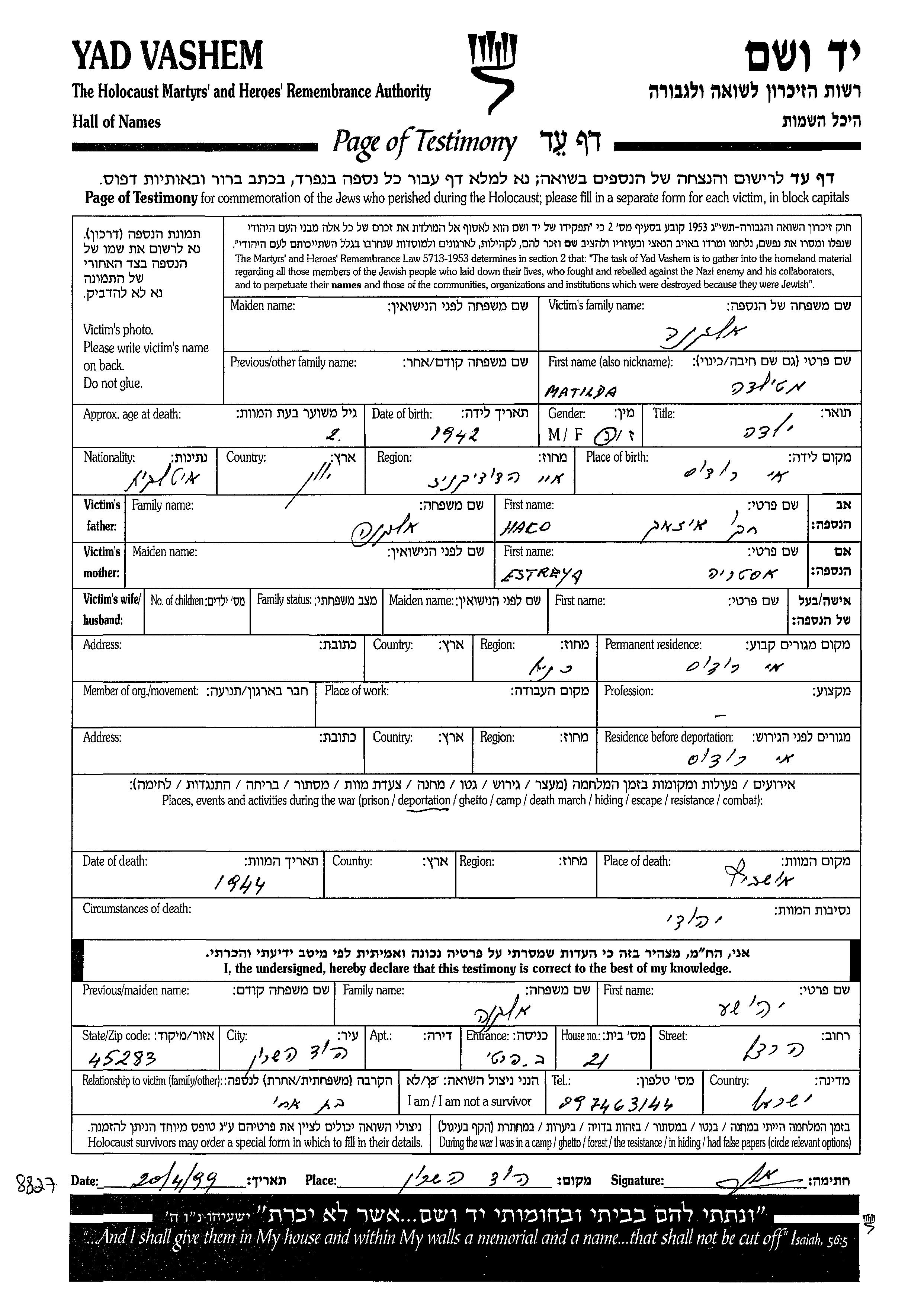 Matilda Elkana wurde im Jahr 1942 in Rhodes, Italien geboren. Sie war die Tochter von Haco und Estrya. Vor dem Zweiten Weltkrieg lebte sie in Rhodes, Italien. Während des Krieges war sie in Rhodes, Italien. Matilda wurde in der Schoah ermordet. Todesort: Auschwitz, Polen im Jahr 1944.