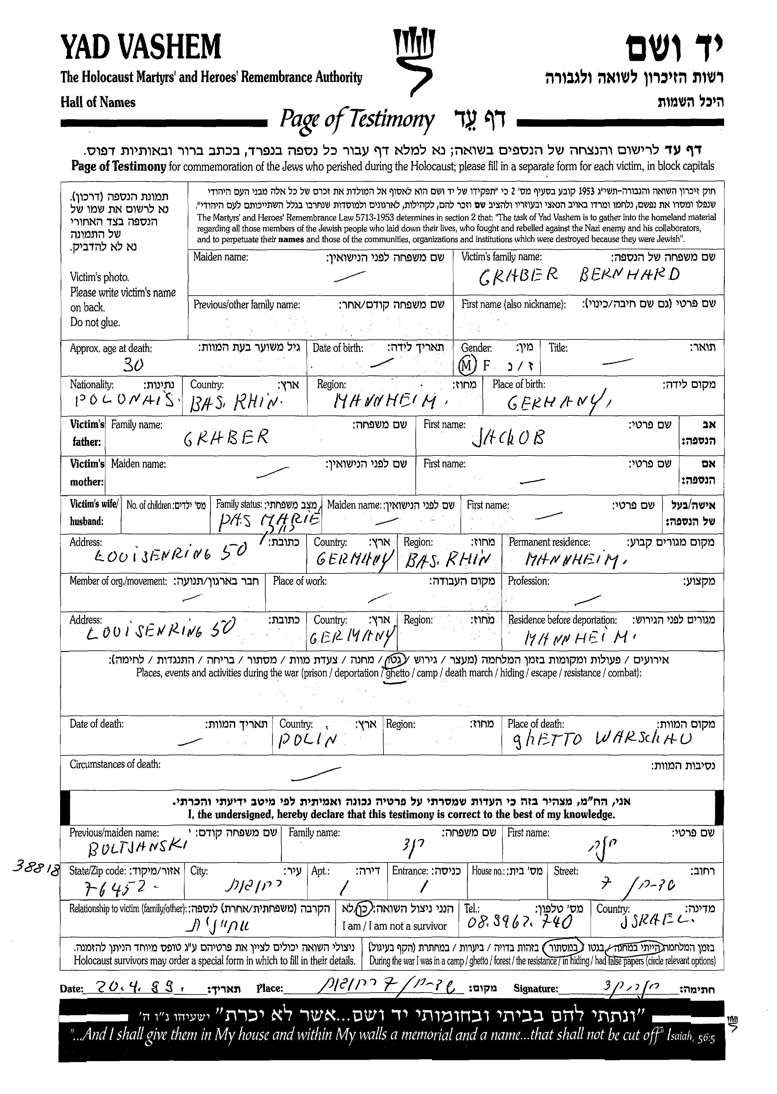 Bernhard wurde in der Schoah ermordet. Todesort: Warszawa, Polen.