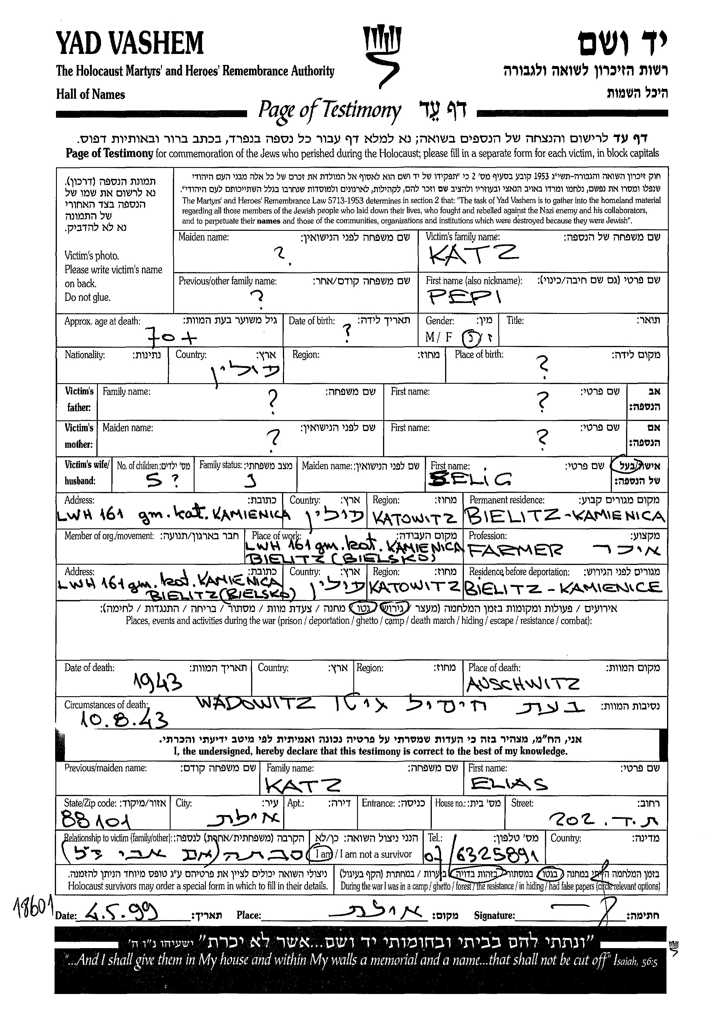 Pepi Katz wurde in Polen geboren. Sie war Landwirt und mit Zelig Verheiratet. Vor dem Zweiten Weltkrieg lebte sie in Bielitz, Polen. Während des Krieges war sie in Bielitz, Polen.