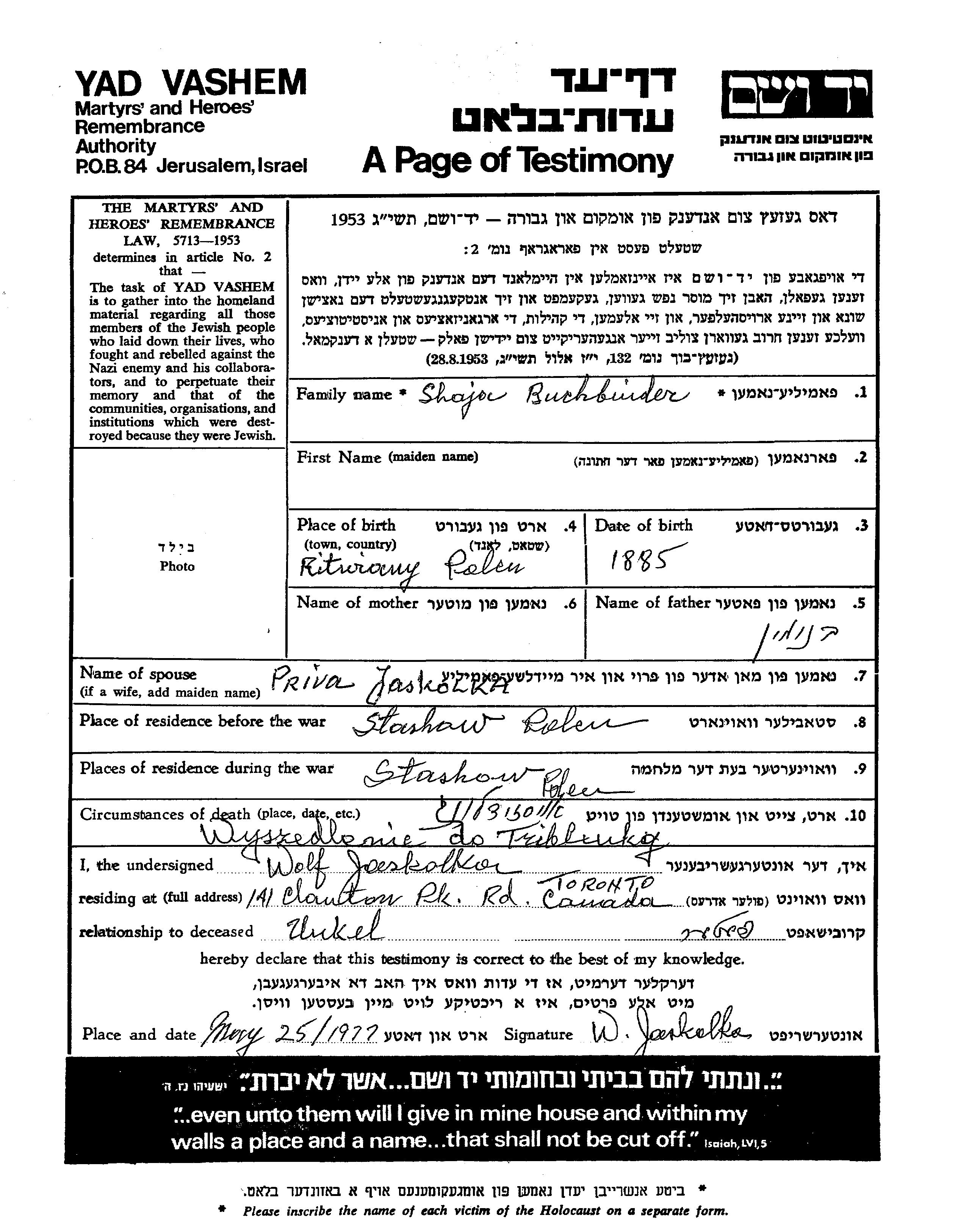 Shaja Buchbinder wurde im Jahr 1885 in Rytwiany, Polen geboren. Er war der Sohn von Beniamin. Er war mit Priva, geb. Jaskolka Verheiratet. Vor dem Zweiten Weltkrieg lebte er in Staszow, Polen. Während des Krieges war er in Staszow, Polen.