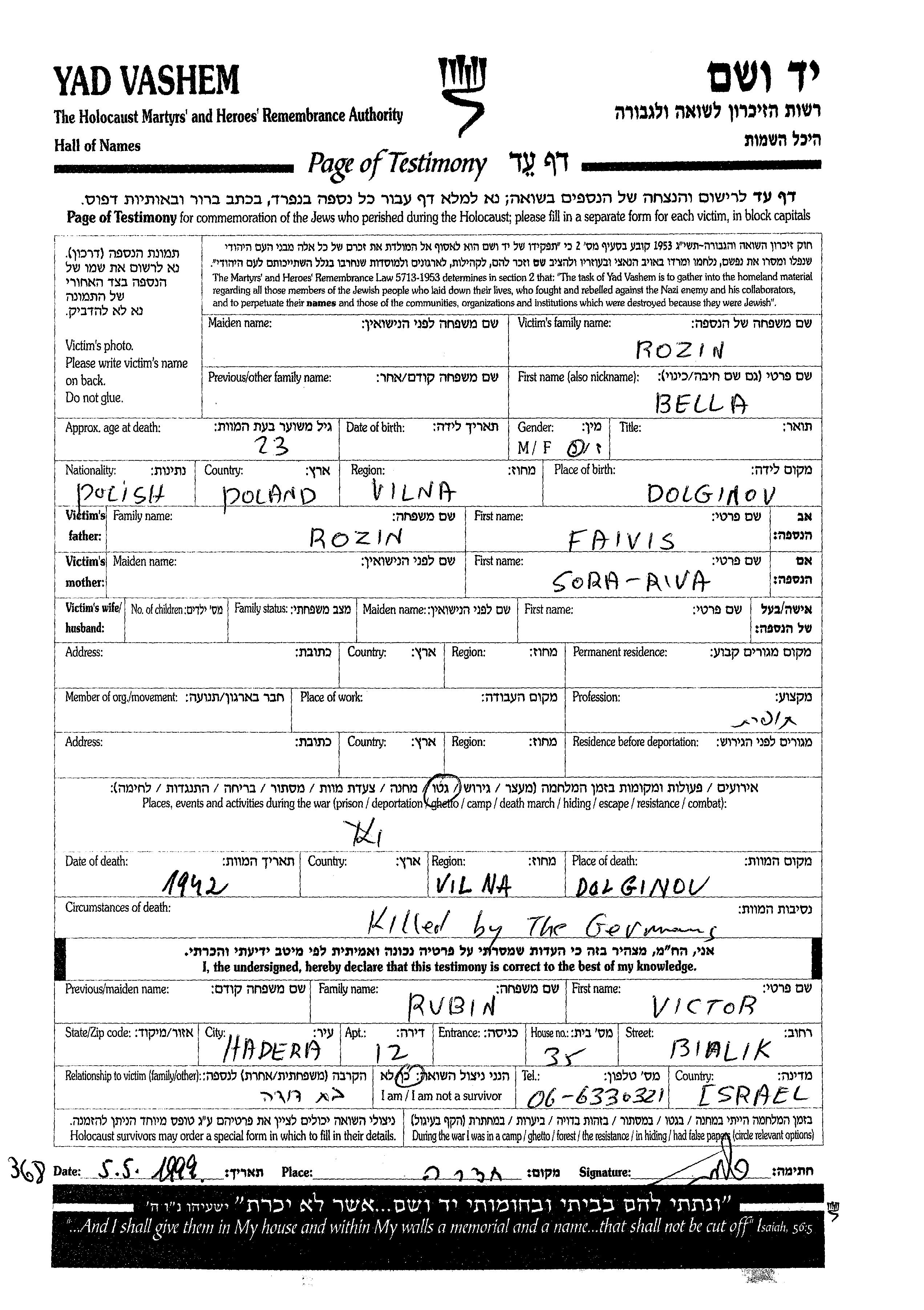 Bella wurde in der Schoah ermordet. Todesort: Dolginov, Polen im Jahr 1942.