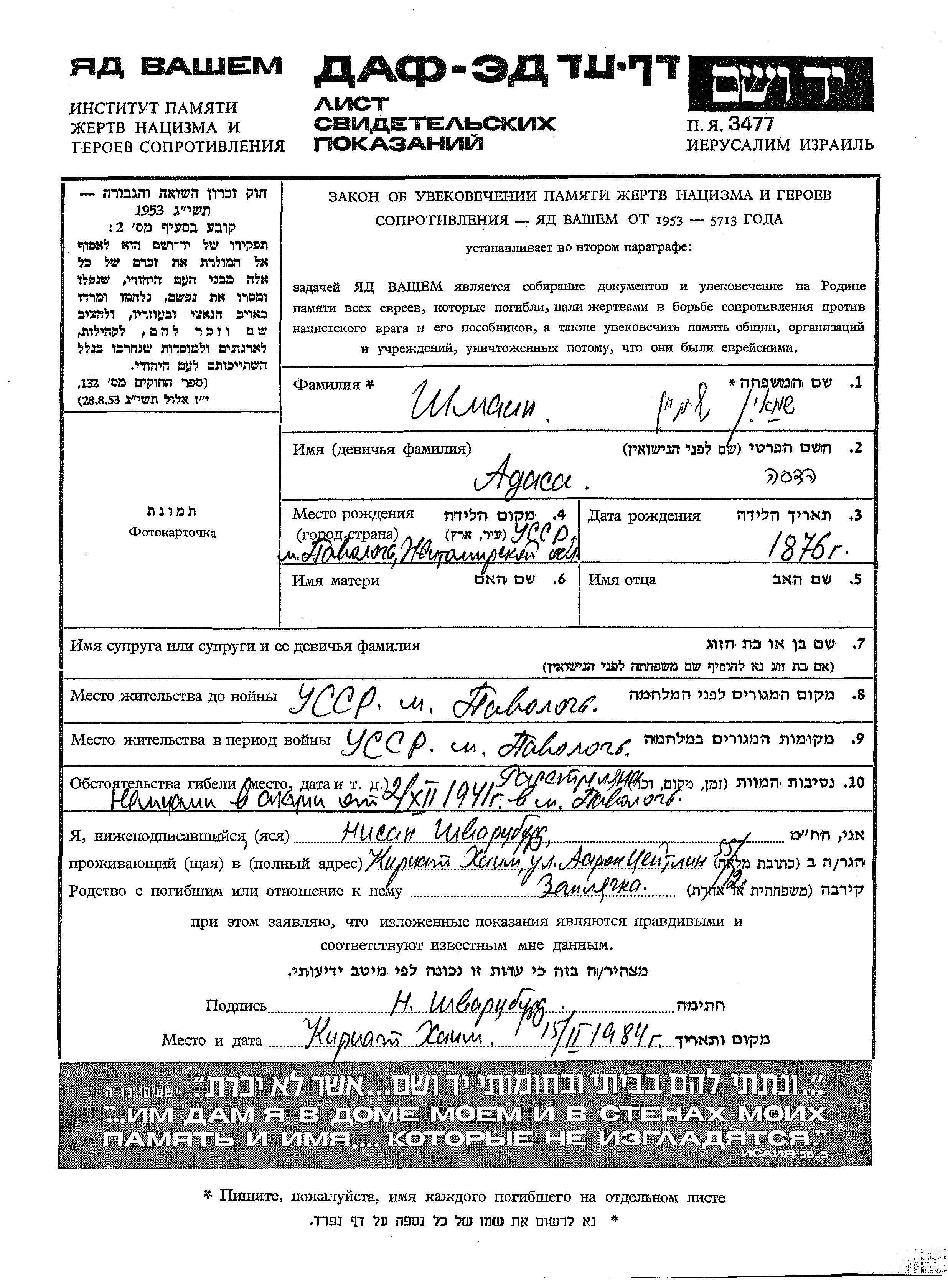 Shmain Adasa 1876 Pavoloch, Ukraine (UdSSR) Gedenkblatt