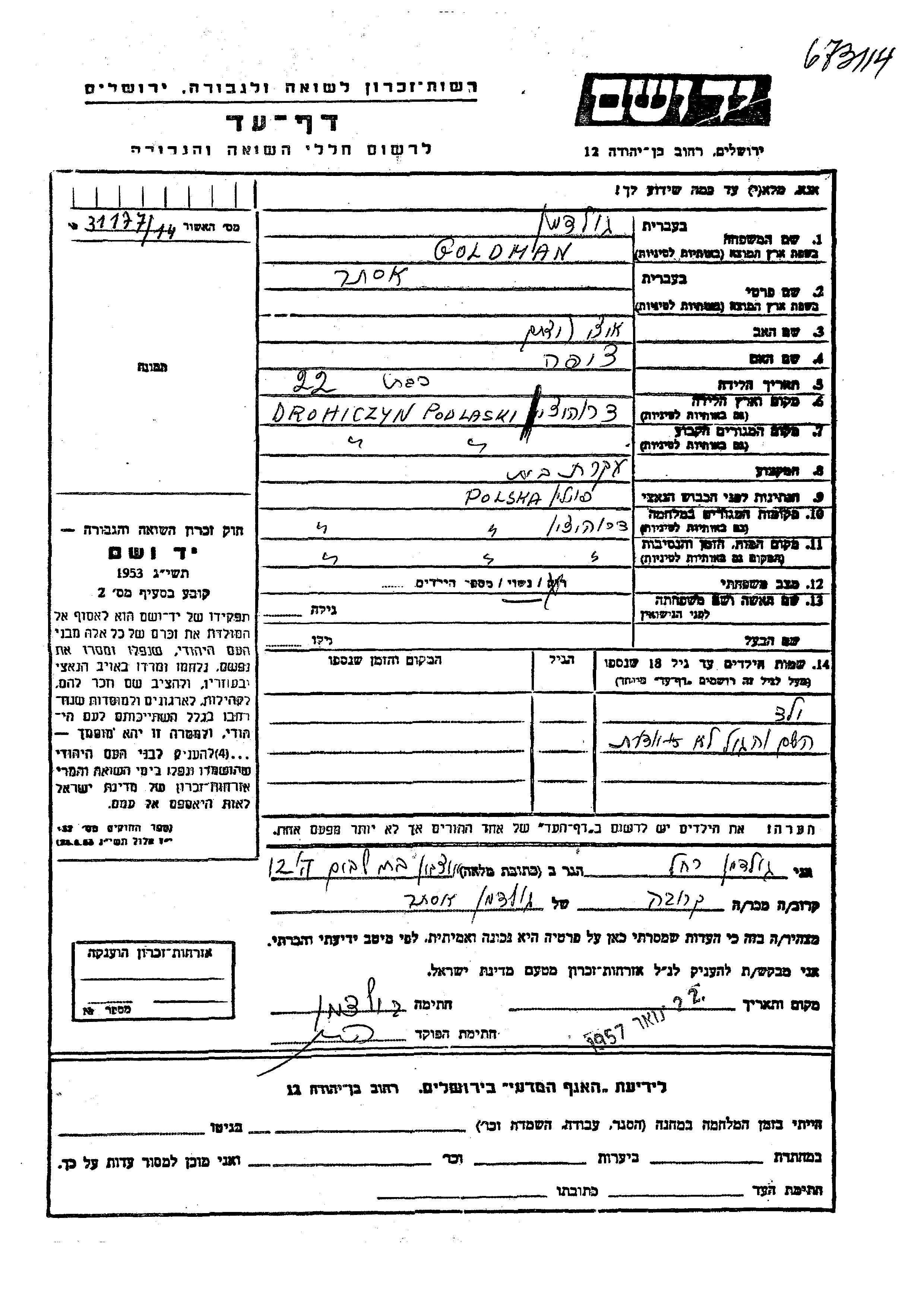 Goldman Ester Drohiczyn, Polen Gedenkblatt