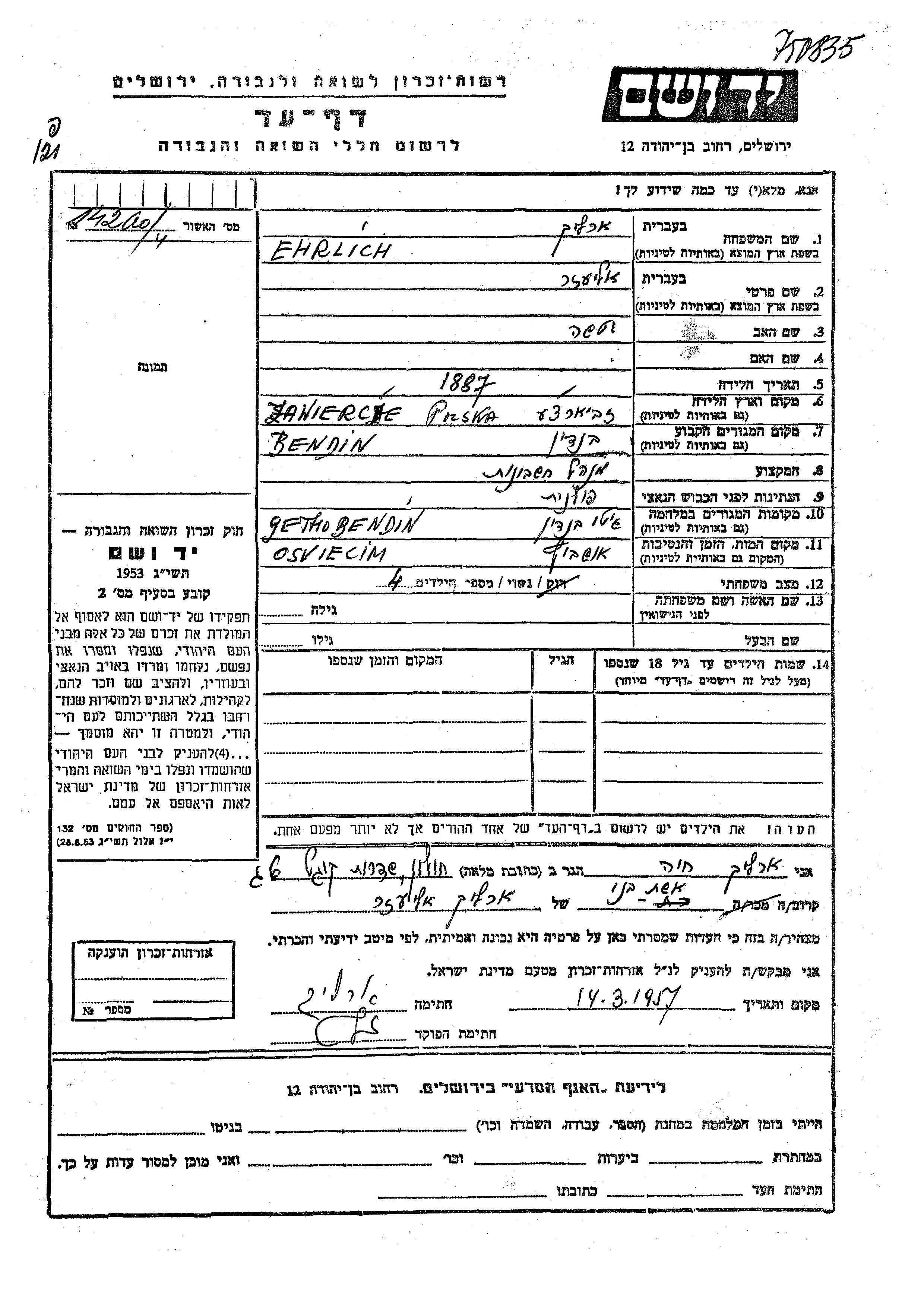 Eliezer Ehrlich wurde im Jahr 1887 in Zawiercie, Polen geboren. Er war der Sohn von Iche. Er war Buchhalter/-in und Verheiratet. Vor dem Zweiten Weltkrieg lebte er in Bendin, Polen. Während des Krieges war er in Będzin, Polen.