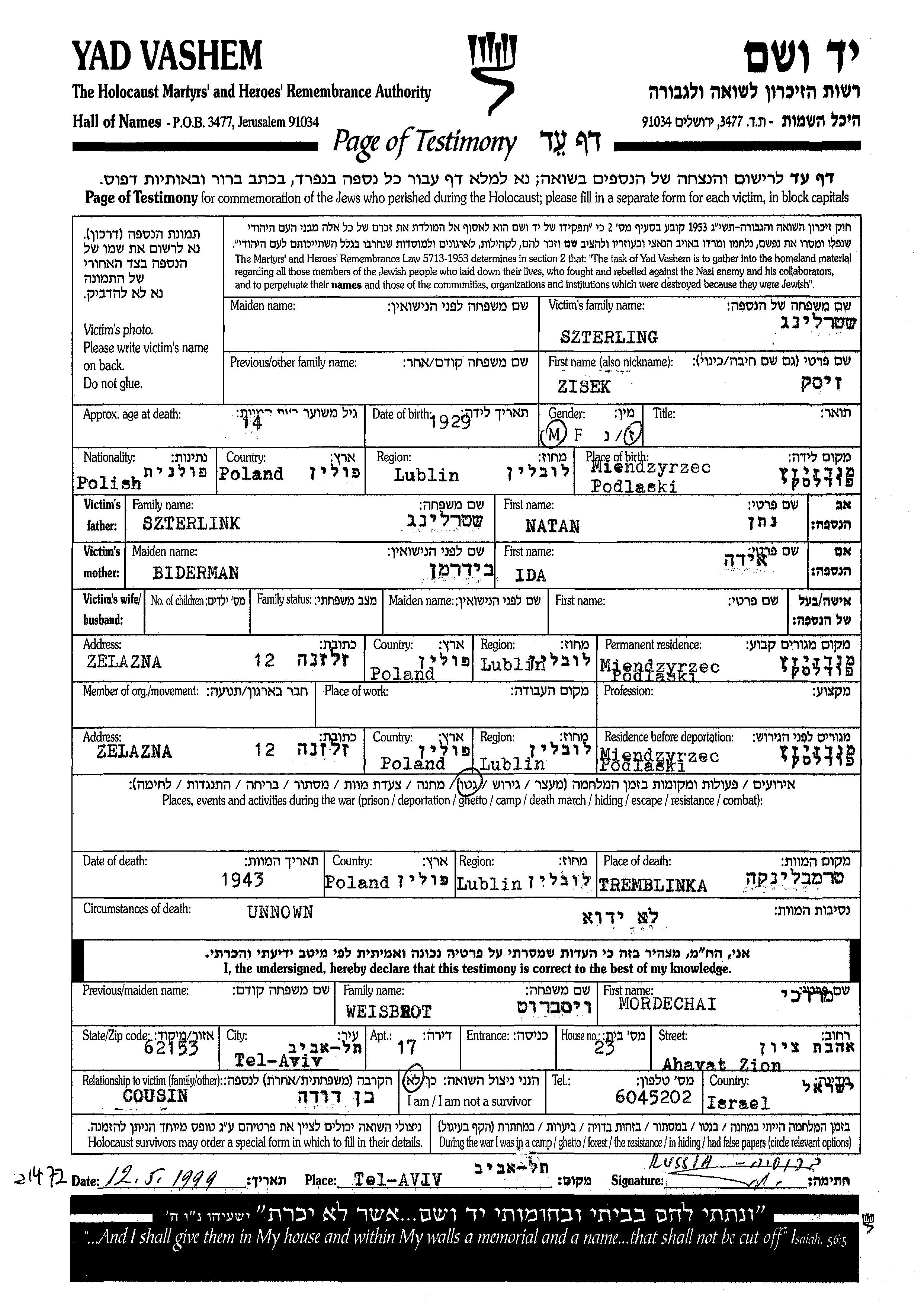 Zisek Szterling wurde im Jahr 1929 in Miendzyrzec, Polen geboren. Er war der Sohn von Natan und Ida. Er war Ledig. Vor dem Zweiten Weltkrieg lebte er in Miendzyrzec, Polen. Während des Krieges war er in Miendzyrzec, Polen.
