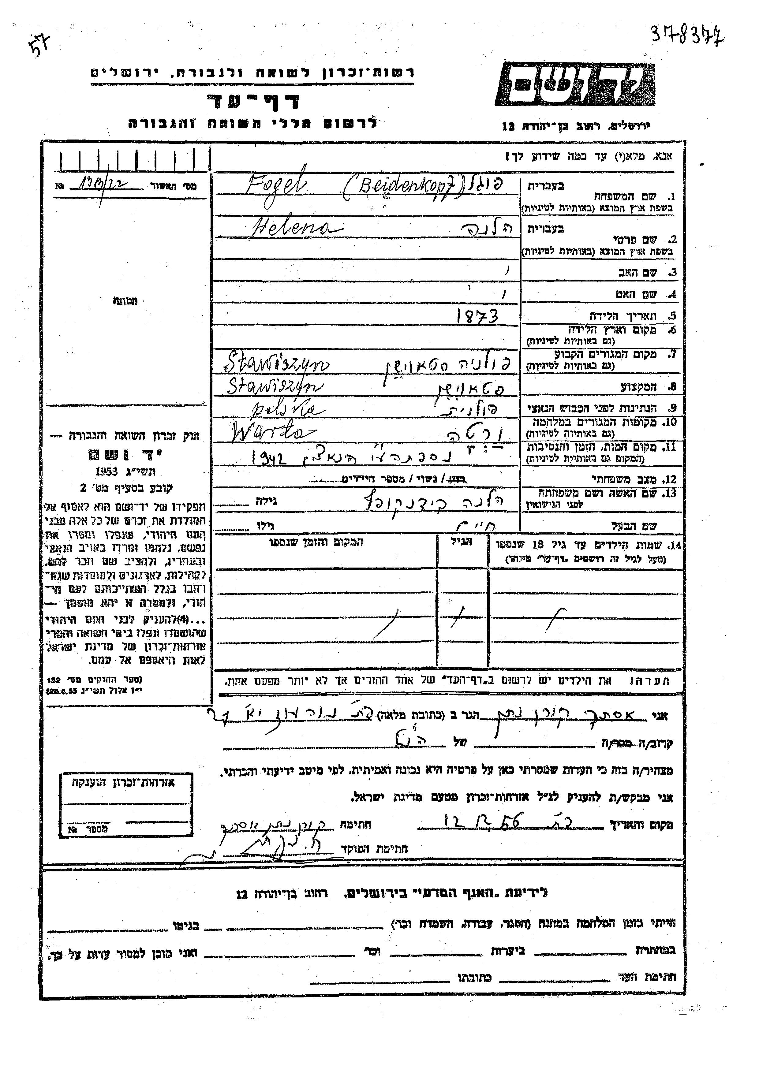 Helena Fogel, geb. Beidenkopf wurde im Jahr 1873 in Stawiszyn, Polen geboren. Sie war mit Khaim Verheiratet. Vor dem Zweiten Weltkrieg lebte sie in Stawiszyn, Polen. Während des Krieges war sie in Warta, Polen.