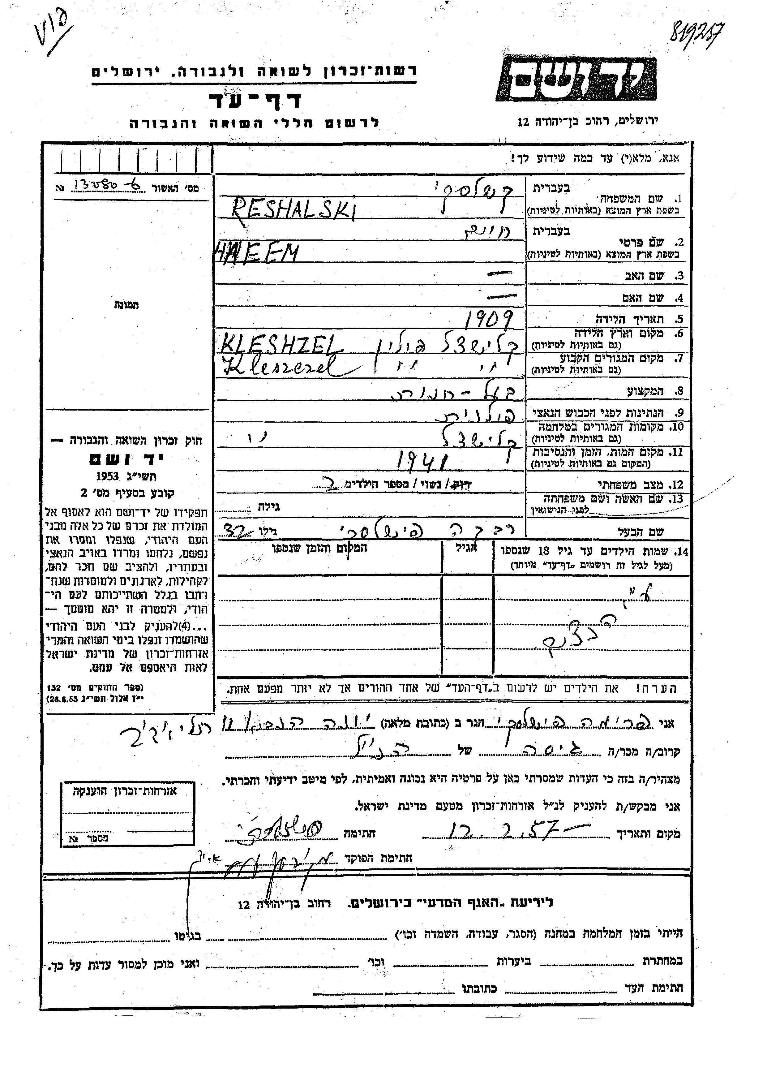 Haeem Keshalski wurde im Jahr 1909 in Kleszczele, Polen geboren. Er war Ladenbesitzer/-in und mit Rivka, geb. Peshalski Verheiratet. Vor dem Zweiten Weltkrieg lebte er in Kleszczele, Polen. Während des Krieges war er in Kleszczele, Polen.
