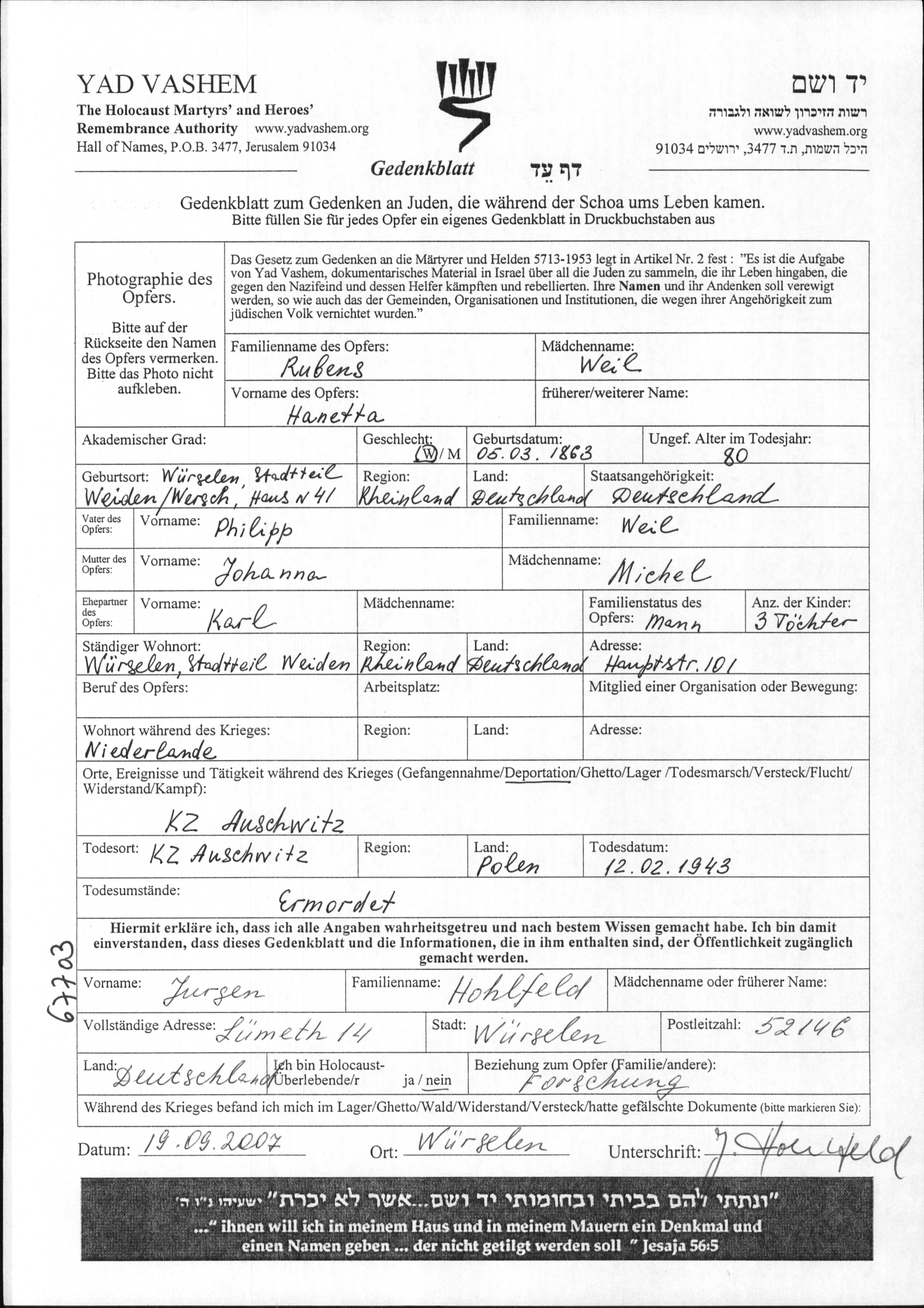 Hanetta Rubens, geb. Weil wurde im Jahr 1863 in Wuerselen, Deutsches Reich geboren. Sie war die Tochter von Philipp und Johanna, geb. Michel. Sie war mit Karl Verheiratet. Vor dem Zweiten Weltkrieg lebte sie in Wuerselen, Deutsches Reich. Während des Krieges war sie in Niederlande.