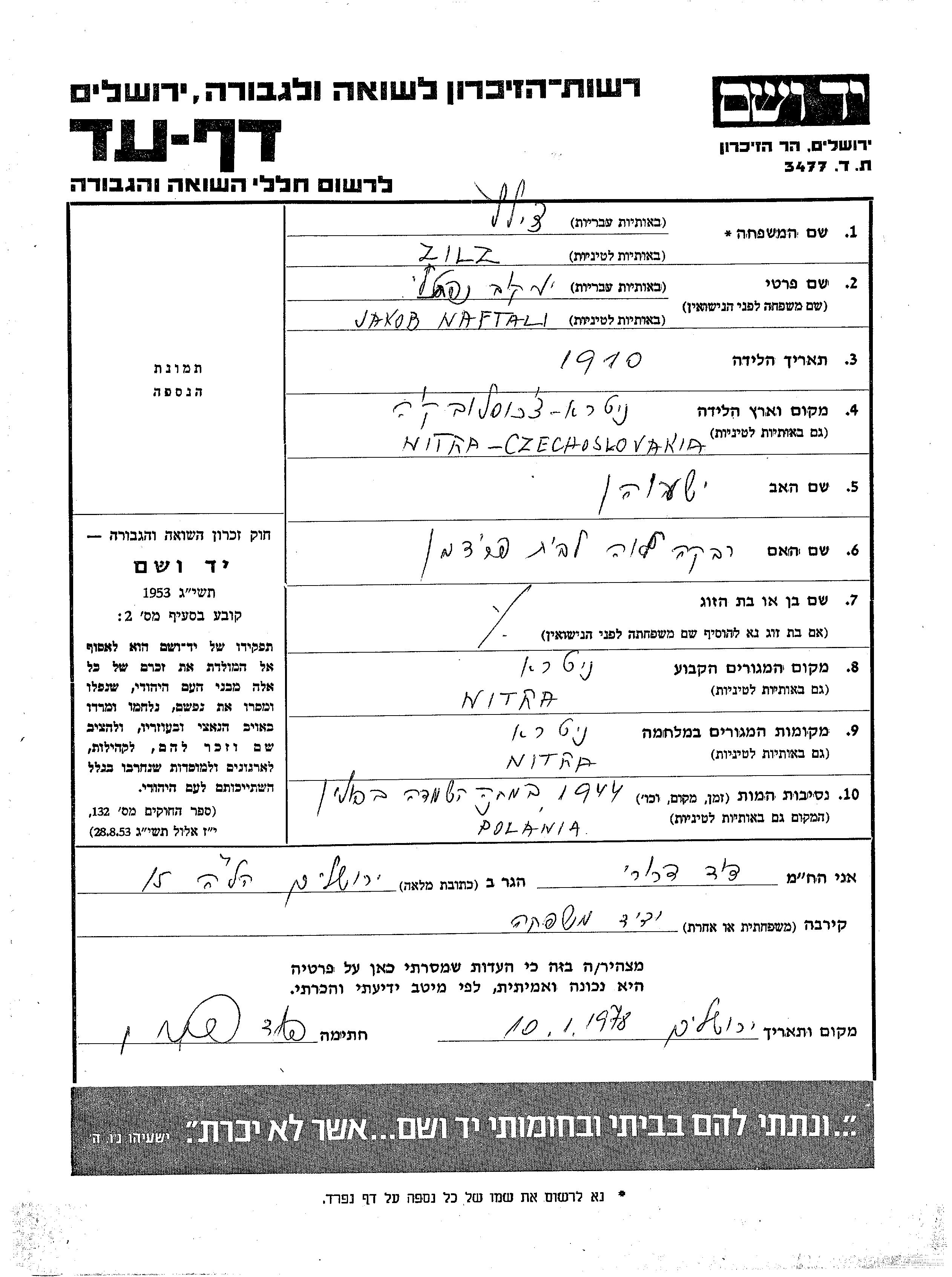 Jakob Naftali Zilz wurde im Jahr 1910 in Nitra, Tschechoslowakei geboren. Er war der Sohn von Yeshayahu und Rivka Lea. Er war Ledig. Vor dem Zweiten Weltkrieg lebte er in Nitra, Tschechoslowakei. Während des Krieges war er in Nitra, Tschechoslowakei.