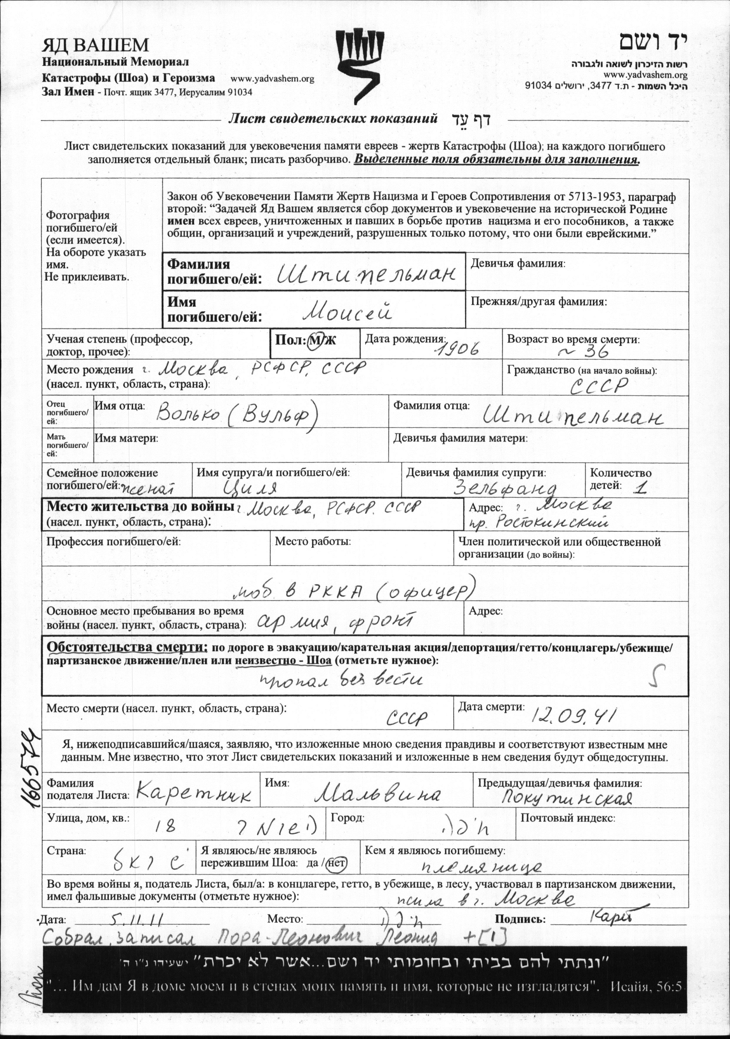 Moisey Shtipelman wurde im Jahr 1906 in Moskva, Russland (UdSSR) geboren. Er war der Sohn von Volko. Er war mit Tzilya, geb. Zelfand Verheiratet. Vor dem Zweiten Weltkrieg lebte er in Moskva, Russland (UdSSR). Während des Krieges war er in die Sowjetischen Streitkräfte.