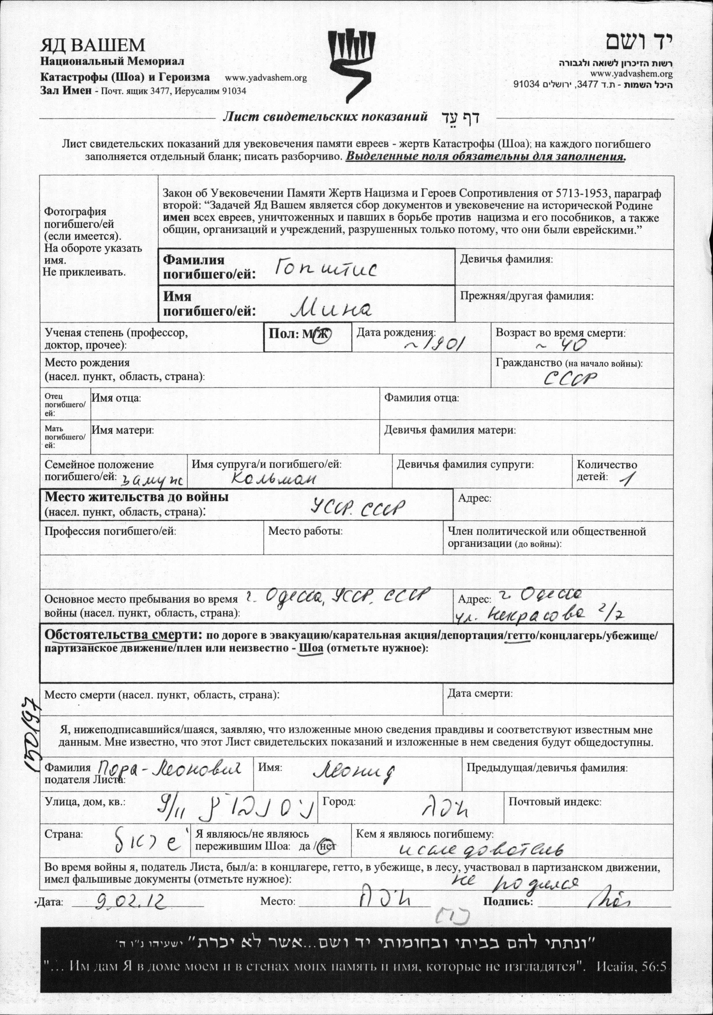 Mina wurde in der Schoah ermordet. Todesort: Odessa, Ukraine (UdSSR).