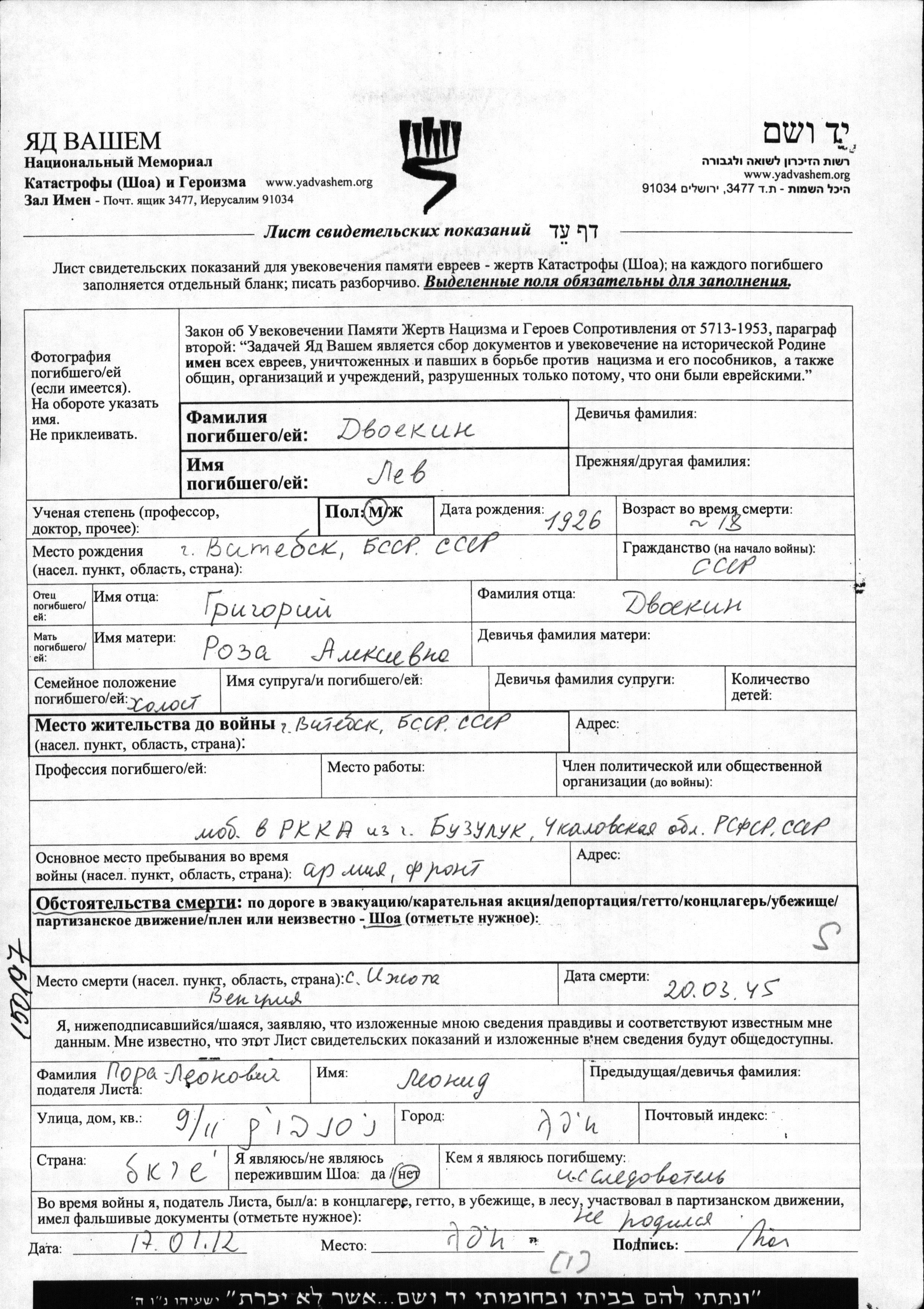 Lev Dvoyekin wurde im Jahr 1926 in Vitebsk, Weißrussland (UdSSR) geboren. Er war der Sohn von Grigoriy und Roza. Er war Ledig. Vor dem Zweiten Weltkrieg lebte er in Vitebsk, Weißrussland (UdSSR). Während des Krieges war er in die Sowjetischen Streitkräfte. Lev im Militärdienst umgekommen. Todesort: Undeciphered Place, Ungarn im Jahr 20/03/1945.