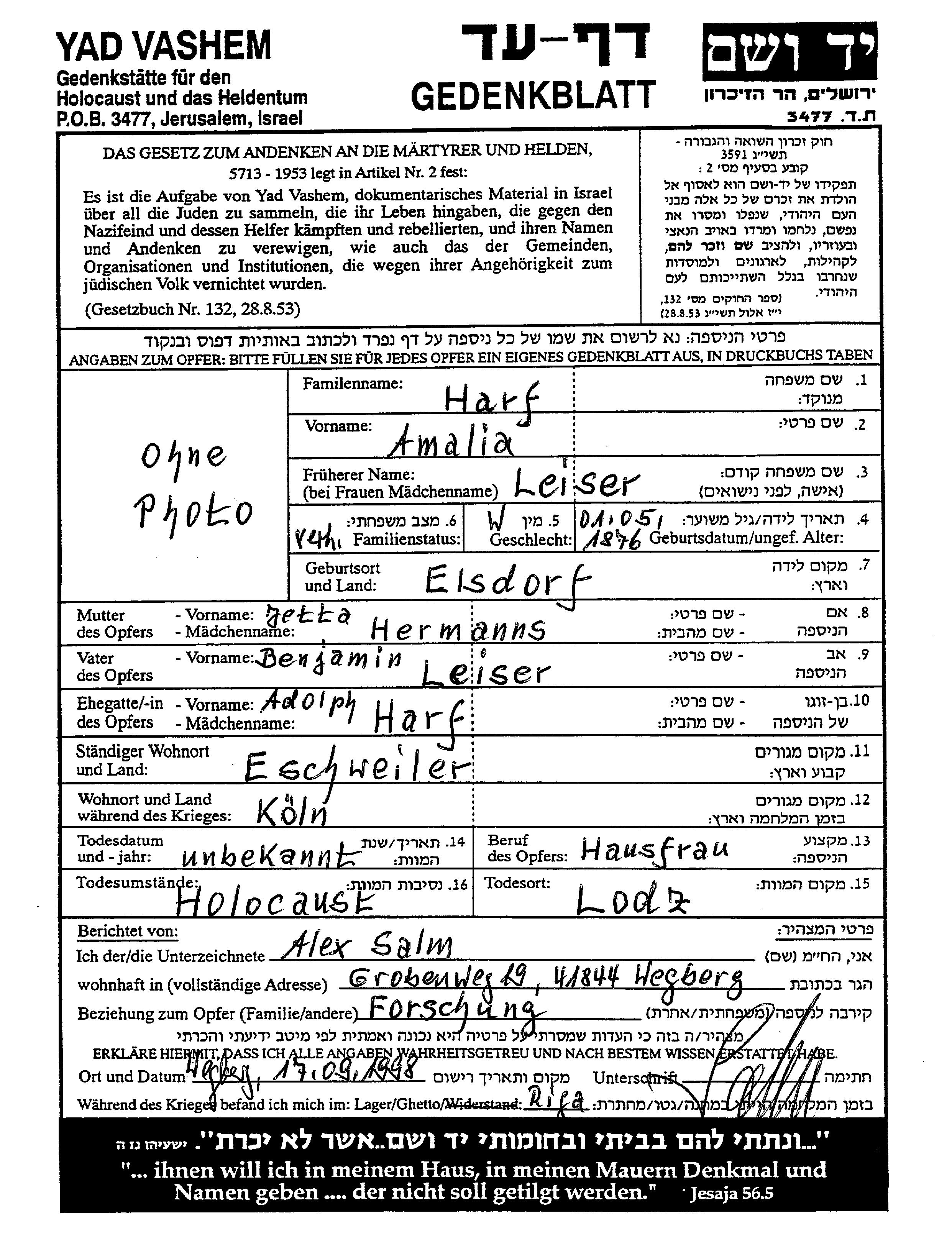 Amalia Harf, geb. Leiser wurde im Jahr 1876 in Elsdorf, Deutsches Reich geboren. Sie war die Tochter von Benjamin und Jetta. Sie war Hausfrau und mit Adolph Verheiratet. Vor dem Zweiten Weltkrieg lebte sie in Eschweiler, Deutsches Reich. Während des Krieges war sie in Koeln, Deutsches Reich. Amalia wurde in der Schoah ermordet. Todesort: Lodz, Polen.