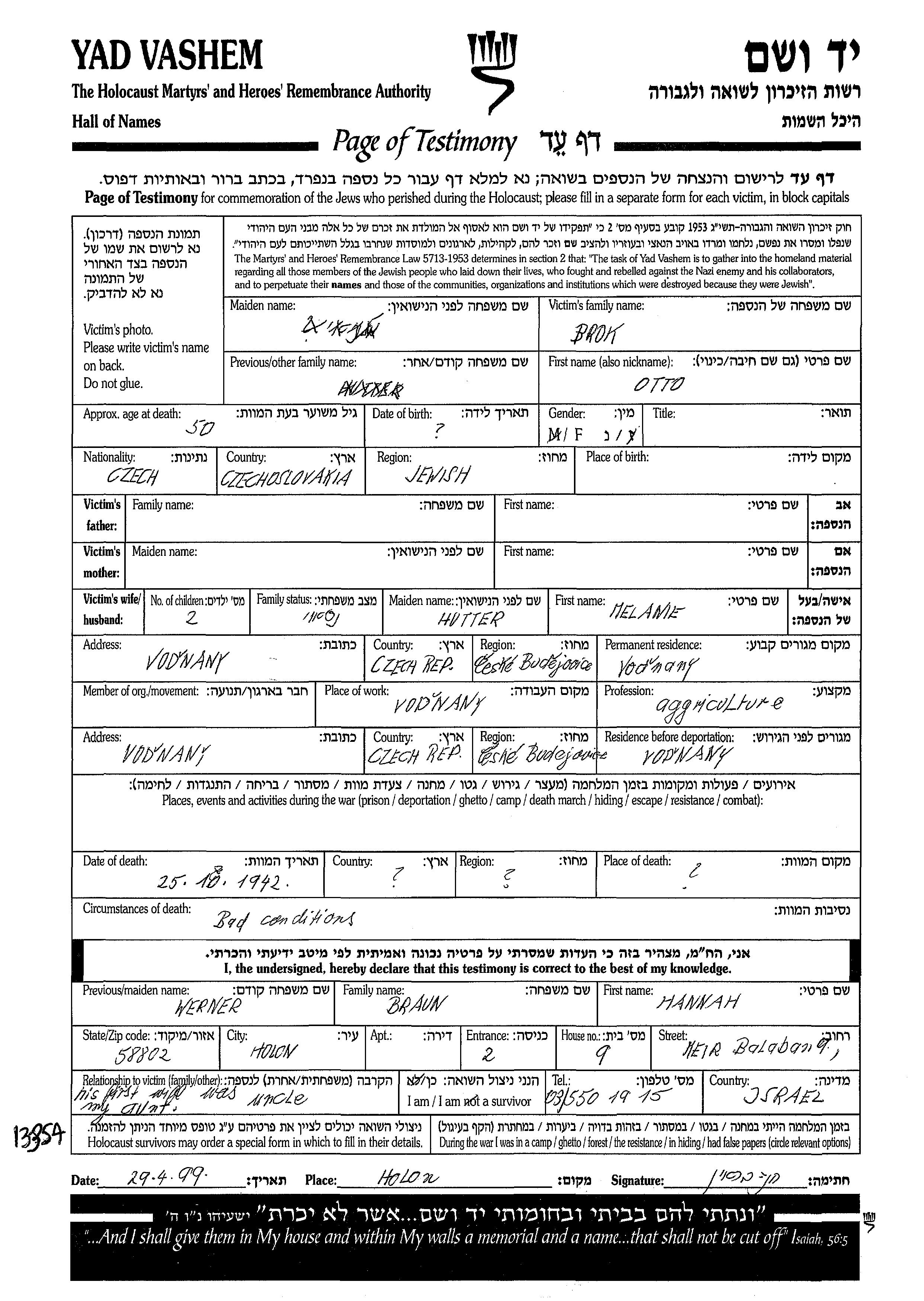 Otto Brok wurde in Tschechoslowakei geboren. Er war Landwirt und mit Melania, geb. Hutter Verheiratet. Vor dem Zweiten Weltkrieg lebte er in Vodnany, Tschechoslowakei. Während des Krieges war er in Vodnany, Tschechoslowakei. Otto wurde in der Schoah ermordet. Todesort: unbekannt im Jahr 25/10/1942.