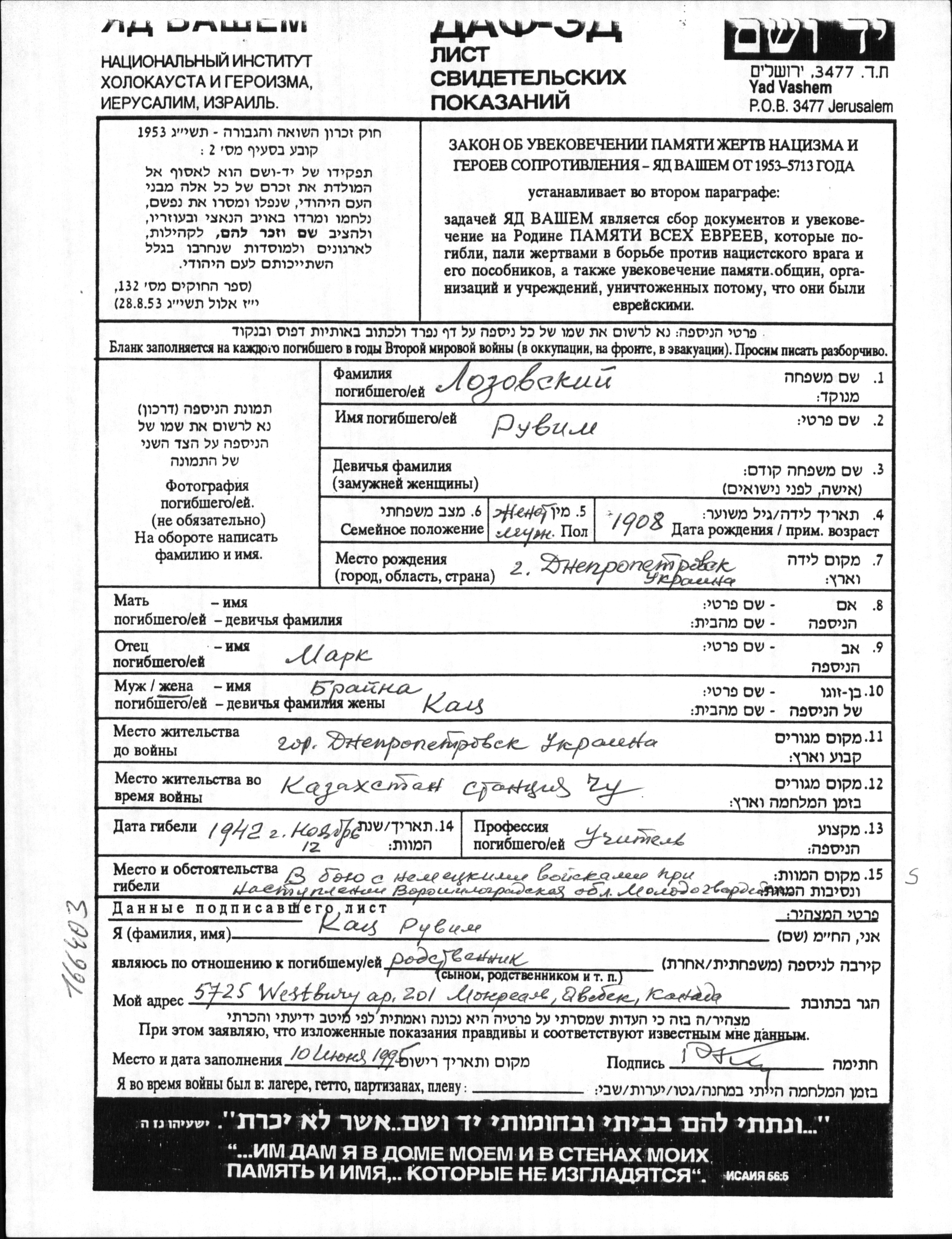 Ruvim Lozovski wurde im Jahr 1908 in Dnepropetrovsk, Ukraine (UdSSR) geboren. Er war der Sohn von Mark. Er war Lehrer/in und mit Brayna, geb. Katz Verheiratet. Vor dem Zweiten Weltkrieg lebte er in Dnepropetrovsk, Ukraine (UdSSR). Während des Krieges war er in die Sowjetischen Streitkräfte. Ruvim im Militärdienst umgekommen. Todesort: Molodogvardeysk, Ukraine (UdSSR) im Jahr 12/11/1942.